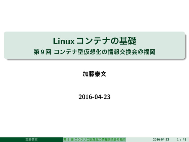 「第9回 コンテナ型仮想化の情報交換会@福岡」の発表資料です。 参考となる情報にはPDF中からリンクをしていますが、資料中のリンクは Speaker Deck 上ではクリックできないので PDF をダウンロードしてご覧ください。