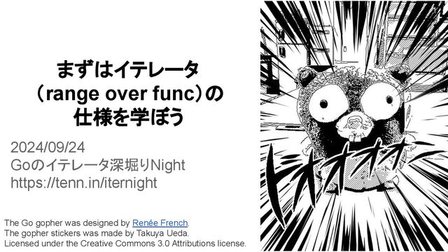 stickers was made by Takuya Ueda. Licensed under the Creative Commons 3.0 Attributions license. まずはイテレータ (range over func)の 仕様を学ぼう 2024/09/24 Goのイテレータ深堀りNight https://tenn.in/iternight 1
