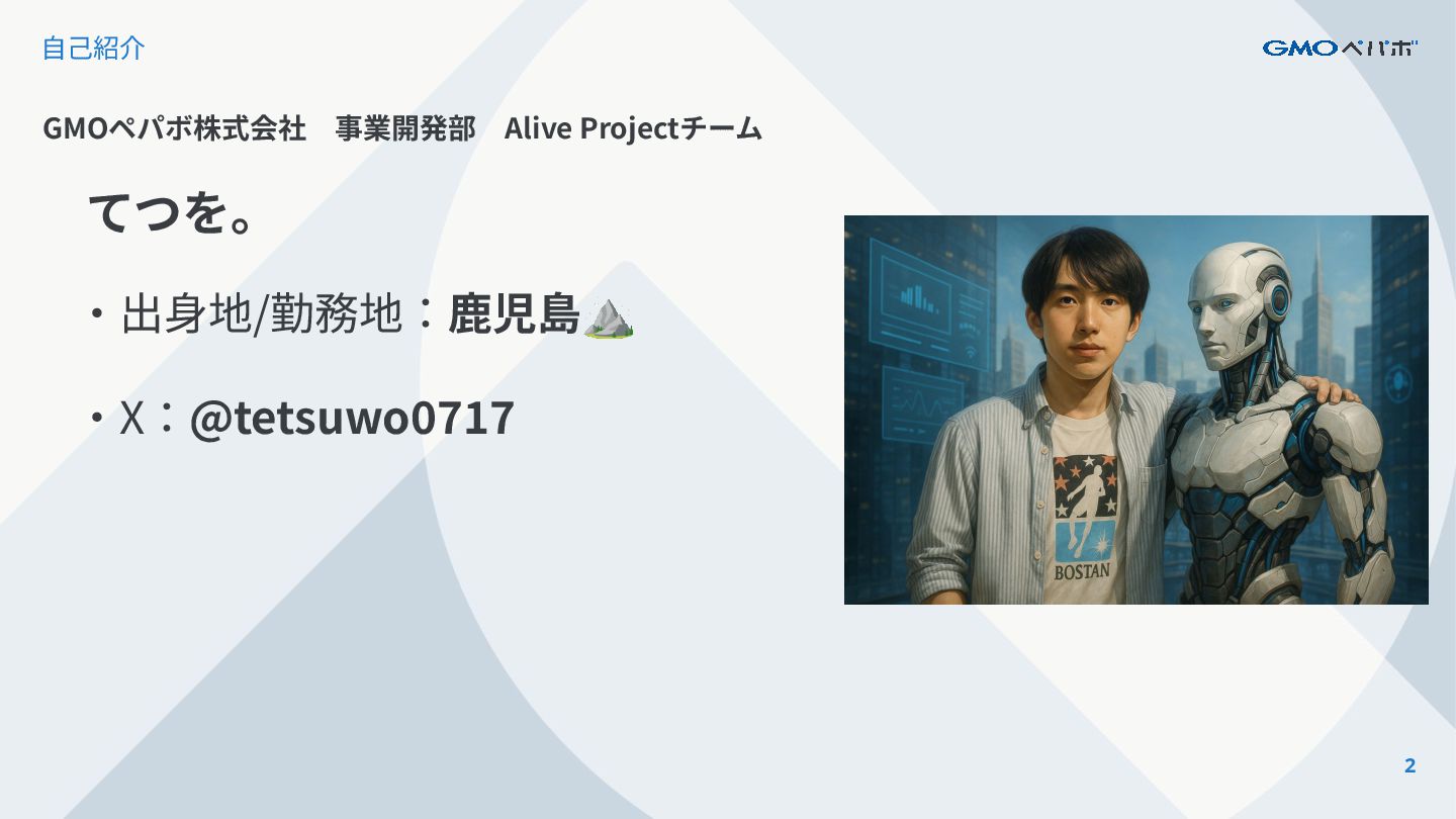 2 ⾃⼰紹介 GMOペパボ株式会社 事業開発部 Alive Projectチーム てつを。 ‧出⾝地/勤務地:⿅児島⛰ ‧X:@tetsuwo0717