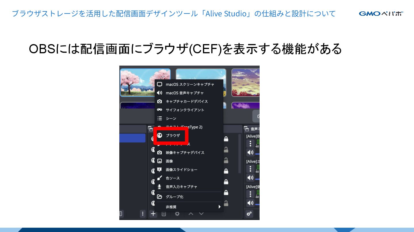 ブラウザストレージを活⽤した配信画⾯デザインツール「Alive Studio」の仕組みと設計について OBSには配信画面にブラウザ(CEF)を表示する機能がある