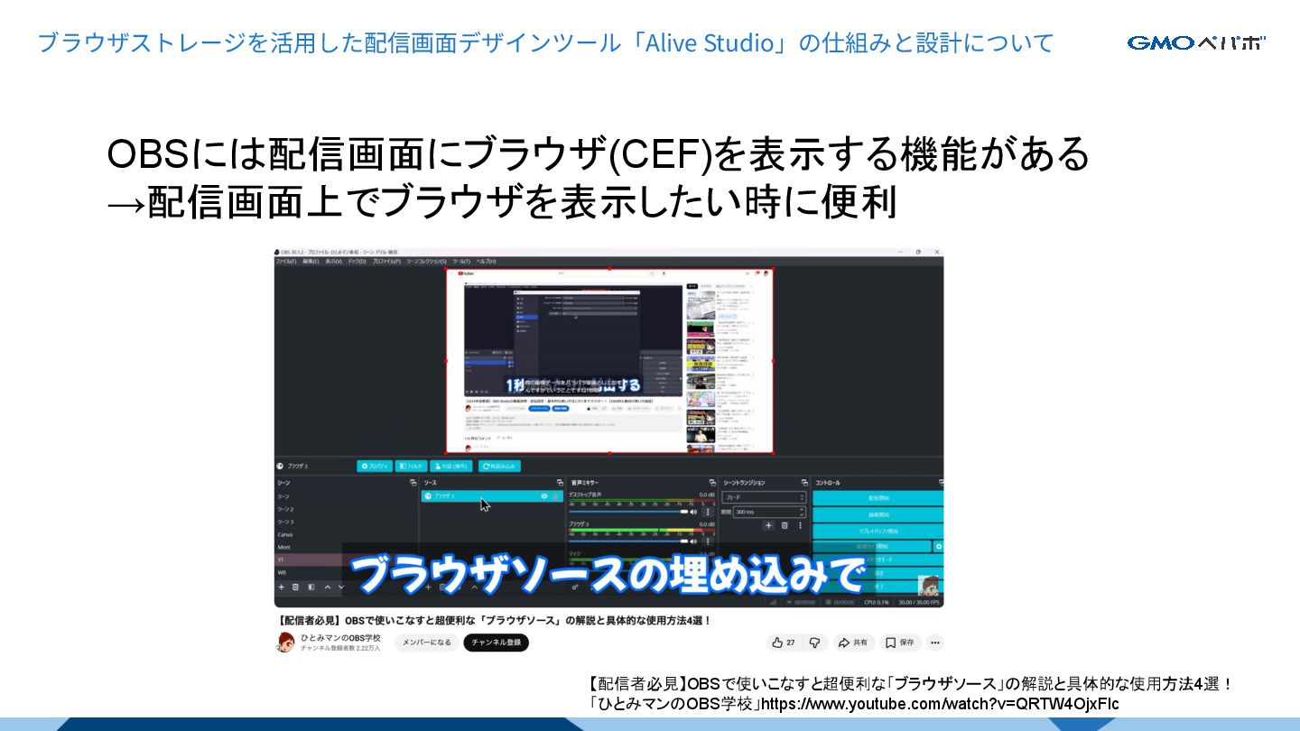 ブラウザストレージを活⽤した配信画⾯デザインツール「Alive Studio」の仕組みと設計について OBSには配信画面にブラウザ(CEF)を表示する機能がある →配信画面上でブラウザを表示したい時に便利 【配信者必見】OBSで使いこなすと超便利な「ブラウザソース」の解説と具体的な使用方法4選! 「ひとみマンのOBS学校」https://www.youtube.com/watch?v=QRTW4OjxFlc
