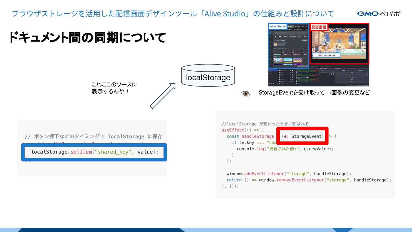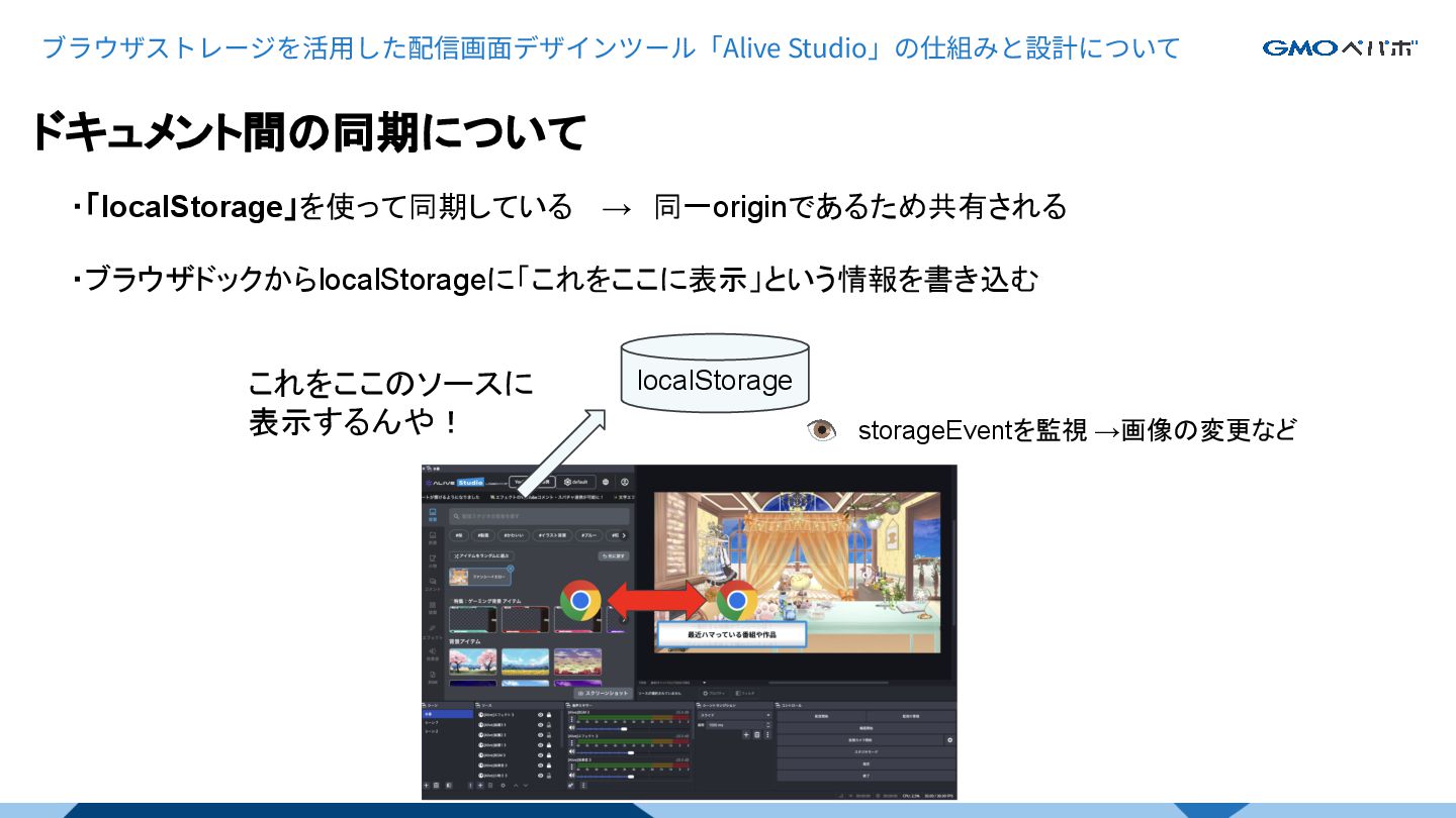 ブラウザストレージを活⽤した配信画⾯デザインツール「Alive Studio」の仕組みと設計について localStorage これここのソースに 表示するんや! 👁 StorageEventを監視 →画像の変更など ドキュメント間の同期について