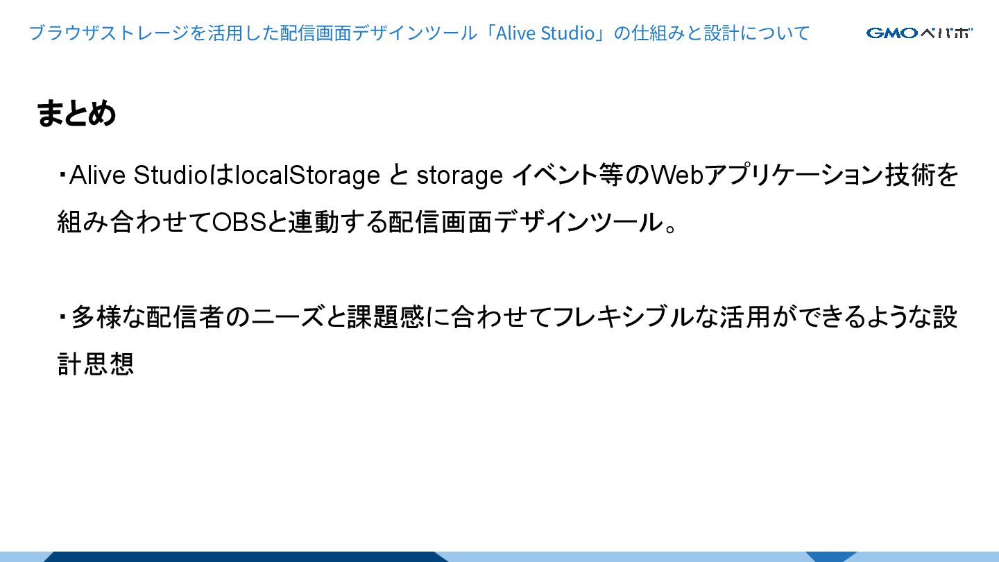 ブラウザストレージを活⽤した配信画⾯デザインツール「Alive Studio」の仕組みと設計について まとめ ・Alive StudioはlocalStorage と storage イベント等のWebアプリケーション技術を 組み合わせてOBSと連動する配信画面デザインツール。 ・多様な配信者のニーズと課題感に合わせてフレキシブルな活用ができるような設