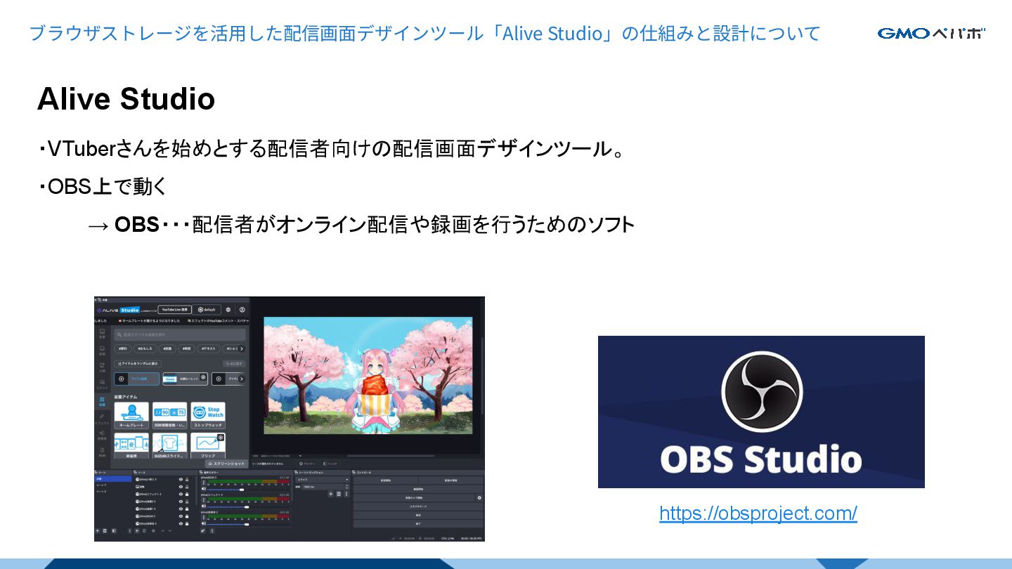 Alive Studio ・VTuberさんを始めとする配信者向けの配信画面デザインツール。 ・OBS上で動く → OBS・・・配信者がオンライン配信や録画を行うためのソフト ブラウザストレージを活⽤した配信画⾯デザインツール「Alive Studio」の仕組みと設計について https://obsproject.com/