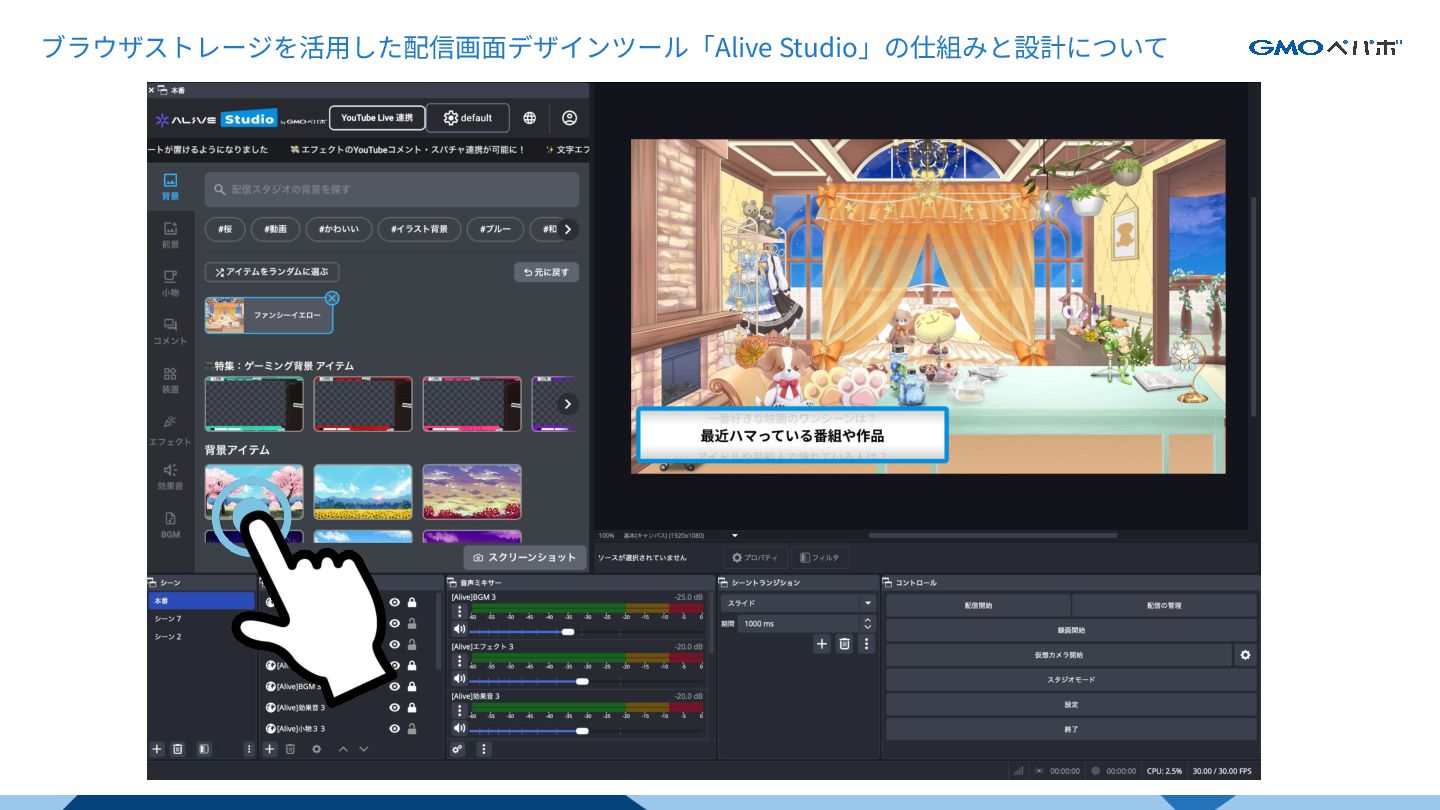 ブラウザストレージを活⽤した配信画⾯デザインツール「Alive Studio」の仕組みと設計について 配信画面 Alive Studio