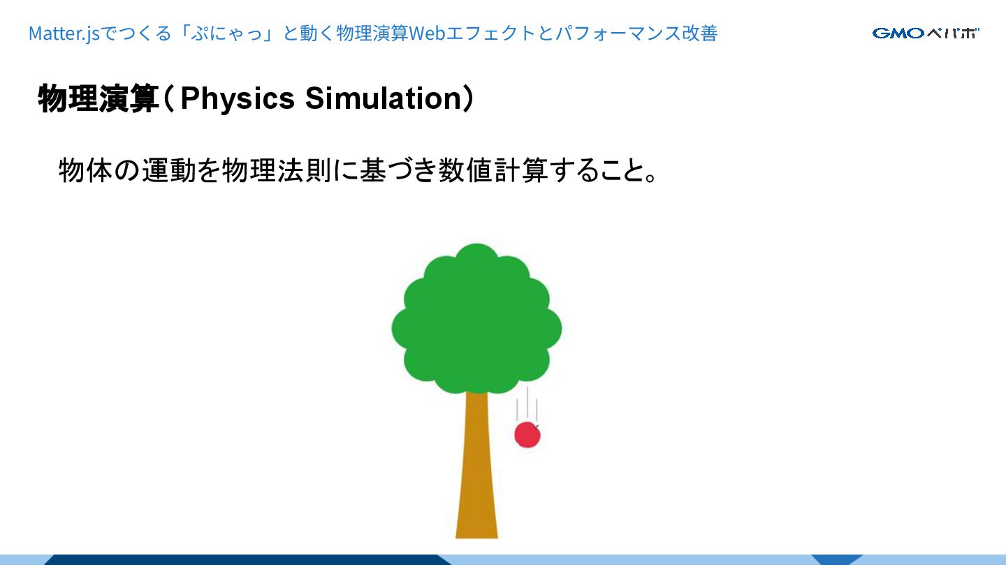 物理演算( Physics Simulation) Matter.jsでつくる「ぷにゃっ」と動く物理演算Webエフェクトとパフォーマンス改善 物体の運動を物理法則に基づき数値計算すること。