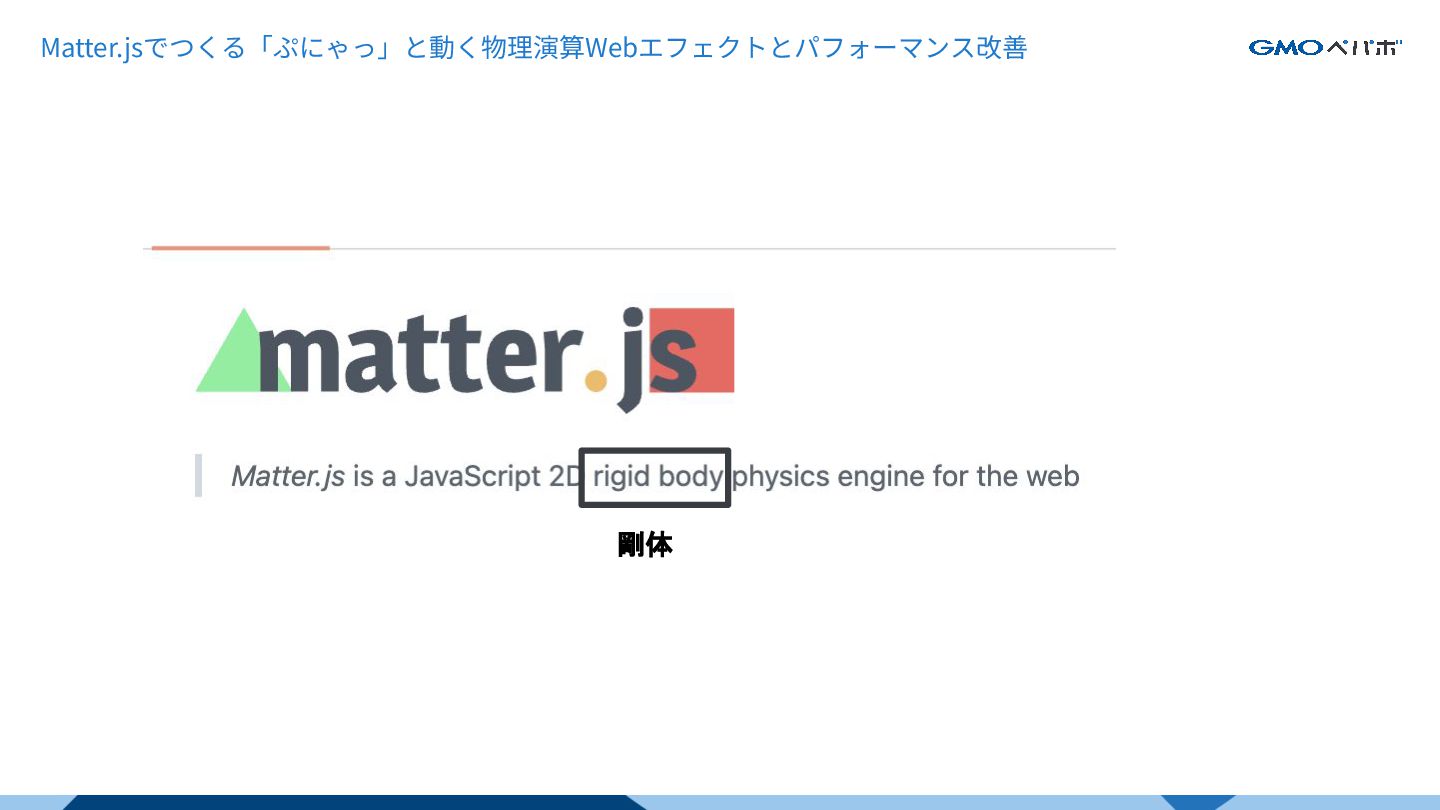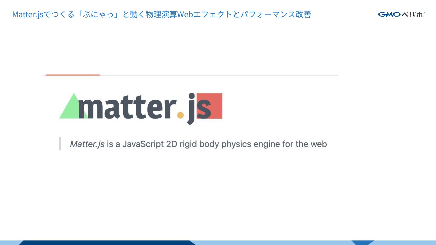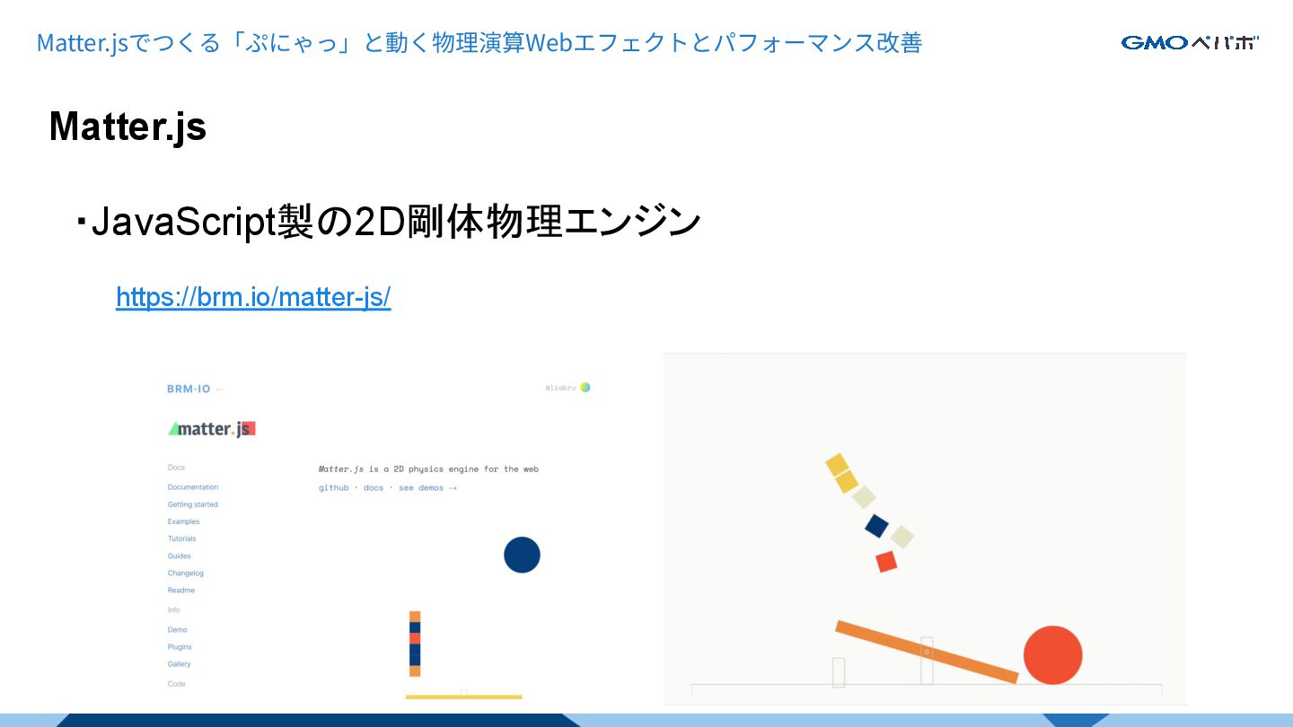 Matter.js Matter.jsでつくる「ぷにゃっ」と動く物理演算Webエフェクトとパフォーマンス改善 ・JavaScript製の2D剛体物理エンジン https://brm.io/matter-js/