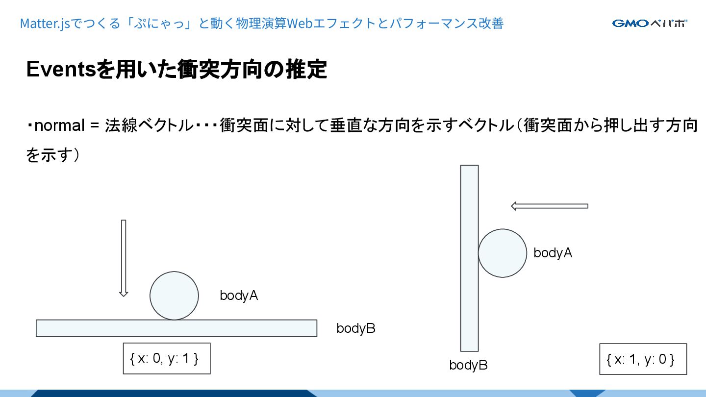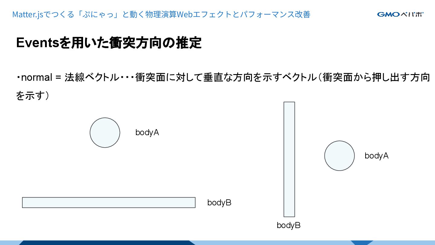 Eventsを用いた衝突方向の推定 Matter.jsでつくる「ぷにゃっ」と動く物理演算Webエフェクトとパフォーマンス改善 ・normal = 法線ベクトル・・・衝突面に対して垂直な方向を示すベクトル(衝突面から押し出す方向 を示す) bodyA bodyB bodyA bodyB