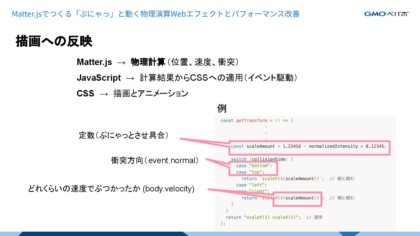 Matter.jsでつくる「ぷにゃっ」と動く物理演算Webエフェクトとパフォーマンス改善 描画への反映 https://gmodecorp.com/ 素材:ぷにゃん 株式会社ジー・モード 衝突した方向/速度に応じた縮みを表現