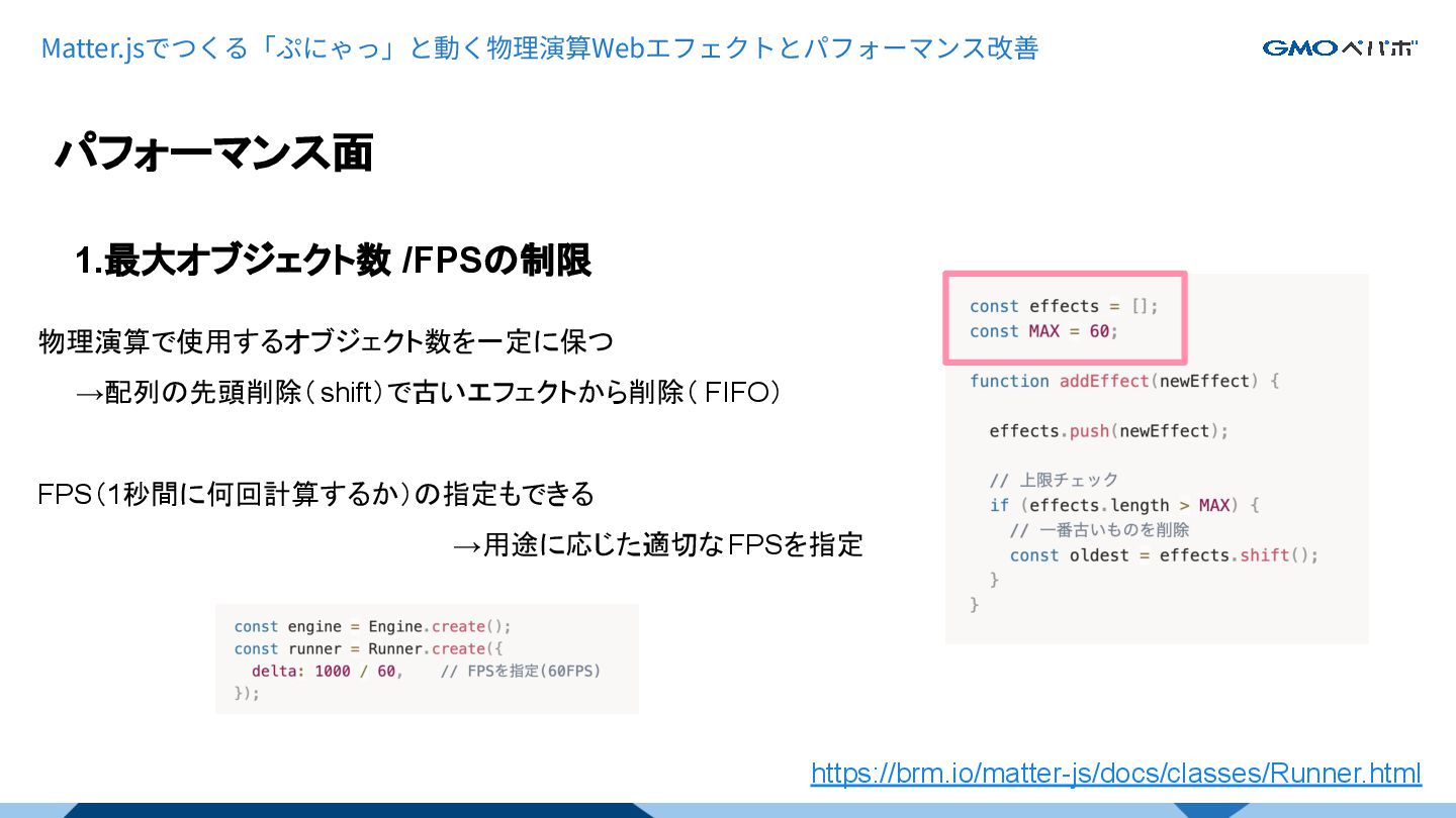 Matter.jsでつくる「ぷにゃっ」と動く物理演算Webエフェクトとパフォーマンス改善 1.最大オブジェクト数 /FPSの制限 パフォーマンス面 物理演算で使用するオブジェクト数を一定に保つ →配列の先頭削除(shift)で古いエフェクトから削除( FIFO) FPS(1秒間に何回計算するか)の指定もできる →用途に応じた適切な FPSを指定