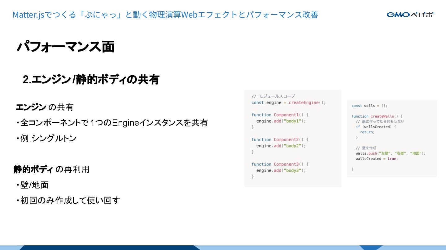 Matter.jsでつくる「ぷにゃっ」と動く物理演算Webエフェクトとパフォーマンス改善 2.エンジン/静的ボディの共有 パフォーマンス面 エンジン の共有 ・全コンポーネントで 1つのEngineインスタンスを共有 ・例:シングルトン 静的ボディ の再利用