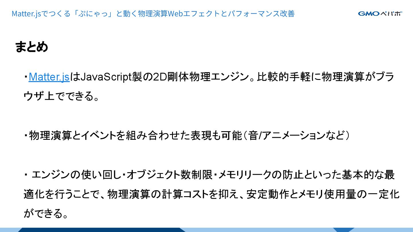 まとめ ・Matter.jsはJavaScript製の2D剛体物理エンジン。比較的手軽に物理演算がブラ ウザ上でできる。 ・物理演算とイベントを組み合わせた表現も可能(音/アニメーションなど) ・ エンジンの使い回し・オブジェクト数制限・メモリリークの防止といった基本的な最 適化を行うことで、物理演算の計算コストを抑え、安定動作とメモリ使用量の一定化 ができる。 Matter.jsでつくる「ぷにゃっ」と動く物理演算Webエフェクトとパフォーマンス改善
