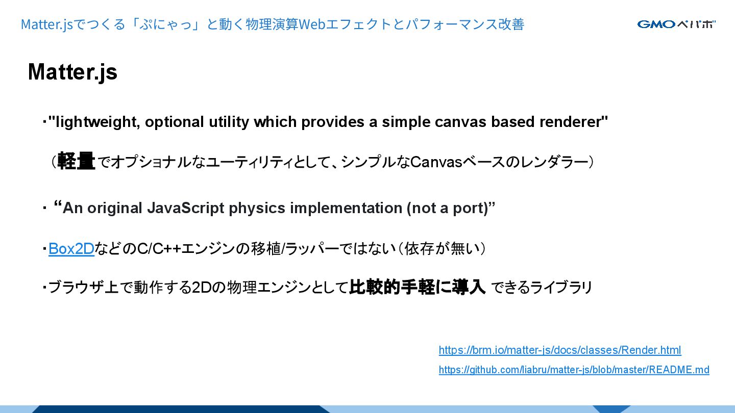 based renderer" (軽量でオプショナルなユーティリティとして、シンプルなCanvasベースのレンダラー) ・ “An original JavaScript physics implementation (not a port)” ・Box2DなどのC/C++エンジンの移植/ラッパーではない(依存が無い) ・ブラウザ上で動作する2Dの物理エンジンとして比較的手軽に導入 できるライブラリ https://brm.io/matter-js/docs/classes/Render.html https://github.com/liabru/matter-js/blob/master/README.md