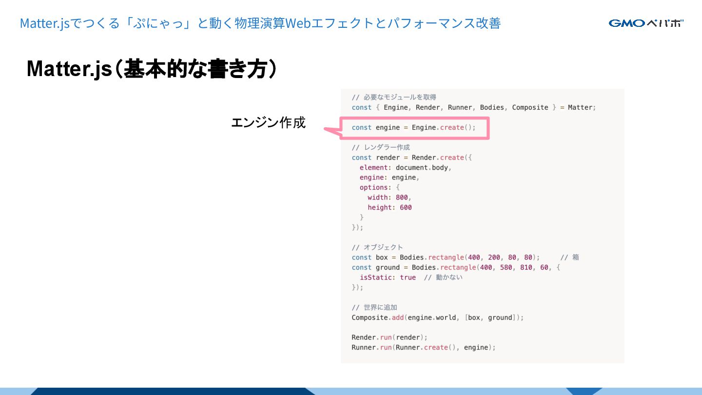 Matter.js(基本的な書き方) Matter.jsでつくる「ぷにゃっ」と動く物理演算Webエフェクトとパフォーマンス改善 エンジン作成