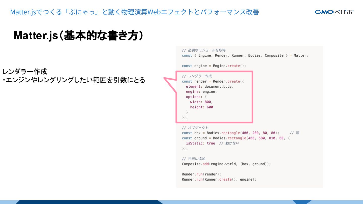Matter.js(基本的な書き方) Matter.jsでつくる「ぷにゃっ」と動く物理演算Webエフェクトとパフォーマンス改善 レンダラー作成 ・エンジンやレンダリングしたい範囲を引数にとる