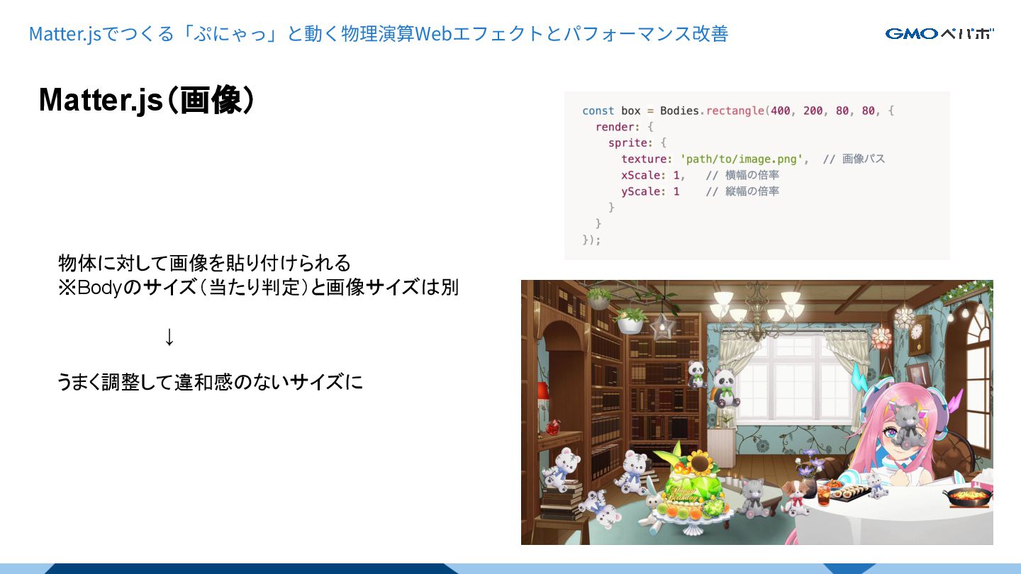 Matter.js(画像) Matter.jsでつくる「ぷにゃっ」と動く物理演算Webエフェクトとパフォーマンス改善 物体に対して画像を貼り付けられる ※Bodyのサイズ(当たり判定)と画像サイズは別 ↓ うまく調整して違和感のないサイズに