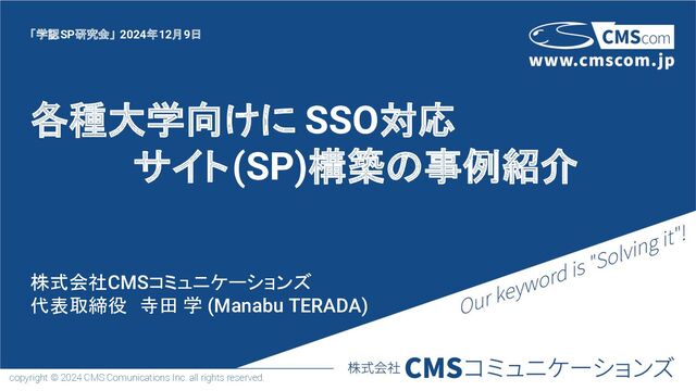 SSO対応 サイト(SP)構築の事例紹介 株式会社CMSコミュニケーションズ 代表取締役 寺田 学 (Manabu TERADA) 「学認SP研究会」 2024年12月9日