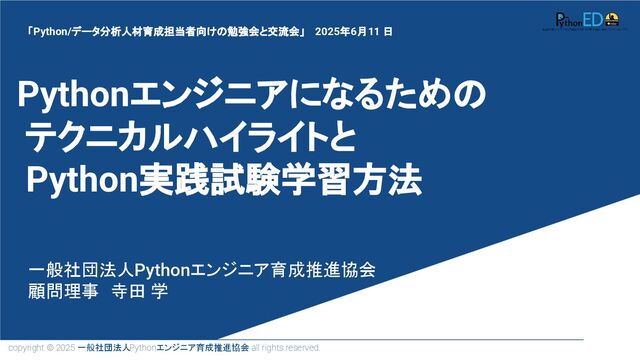 copyright © 2025 一般社団法人Pythonエンジニア育成推進協会 all rights reserved. Pythonエンジニアになるための テクニカルハイライトと Python実践試験学習方法