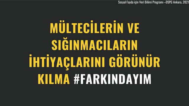 lceğ ortak b r destek mekan zması Sığınmacıların ve mültec ler n ht yaçlarına, sorunlarına ver odaklı b r yaklaşım Ülke genel nde veya bölgesel olarak sığınmacıların ve mültec ler n yaşadığı sıkıntıların herkes tarafından görüleb leceğ b r platform Fayda sağlamak, katkıda bulunmak steyen herkes ç n b r buluşma noktası 1. 2. 3. 4. #Farkındayım Ned r? Sosyal Fayda ç n Ver B l m Programı –DSPG Ankara, 2021 #Farkındayım