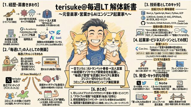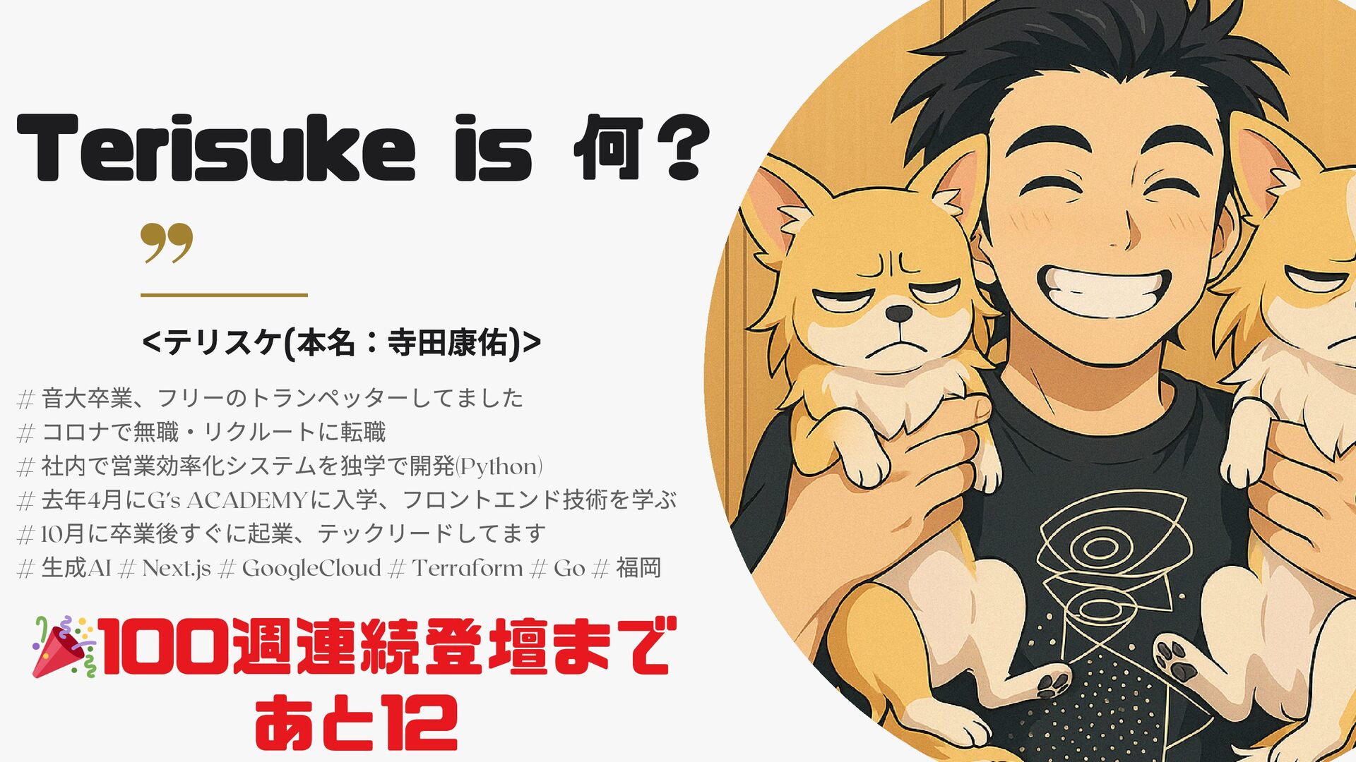 # 社内で営業効率化システムを独学で開発(Python) # 去年4 月にG’s ACADEMY に入学、フロントエンド技術を学ぶ # 10 月に卒業後すぐに起業、テックリードしてます # 生成AI # Next.js # GoogleCloud # Terraform # Go # 福岡 🎉100週連続登壇まで あと12