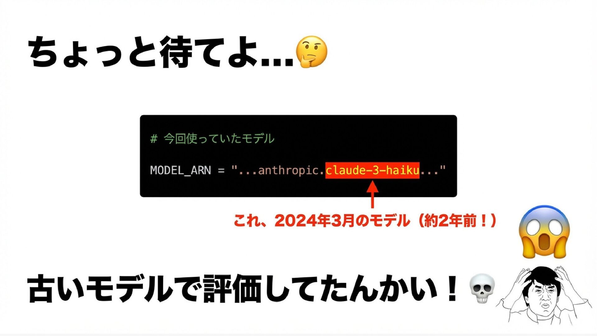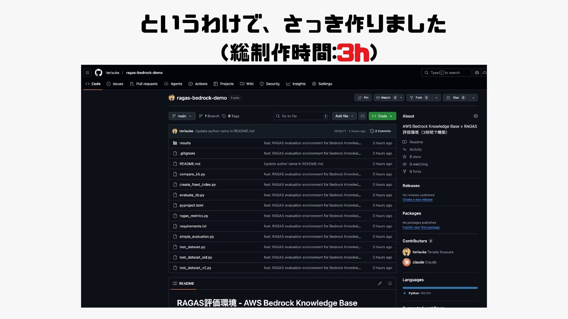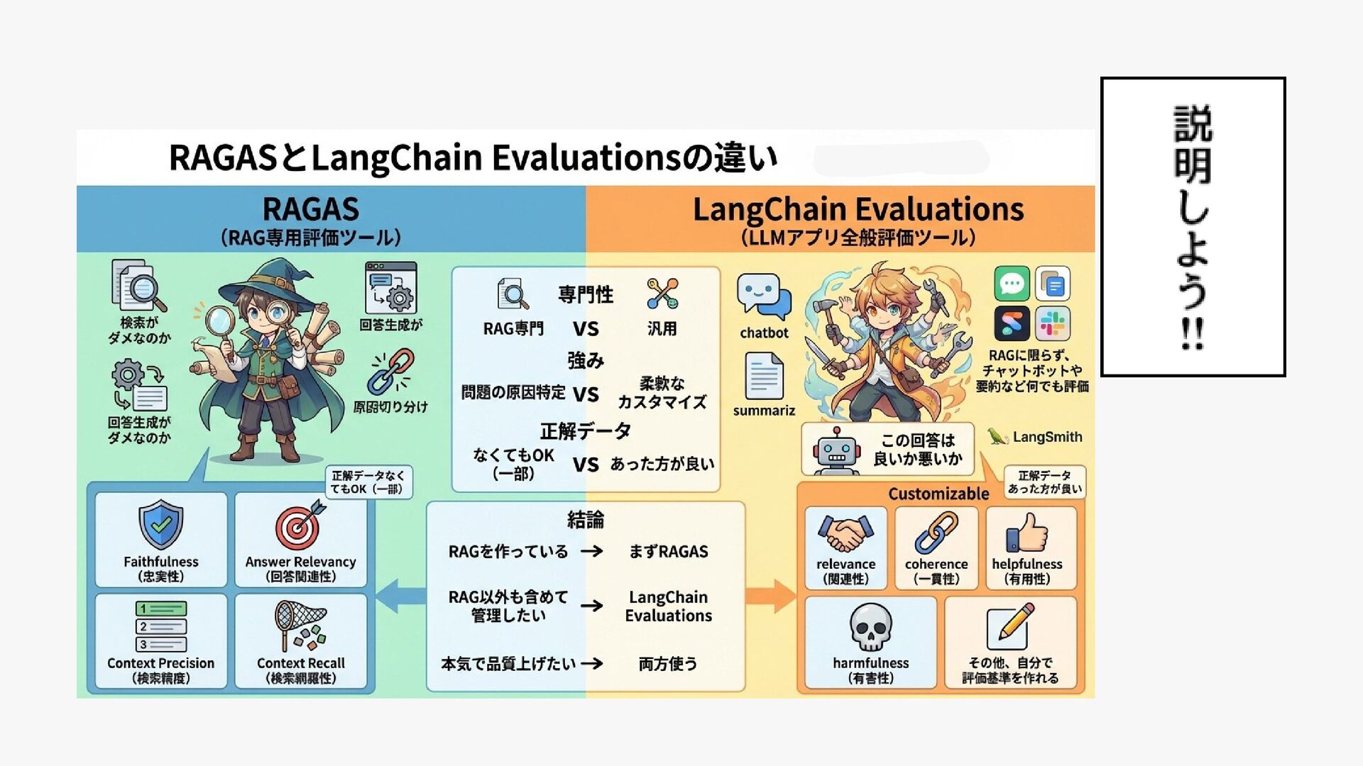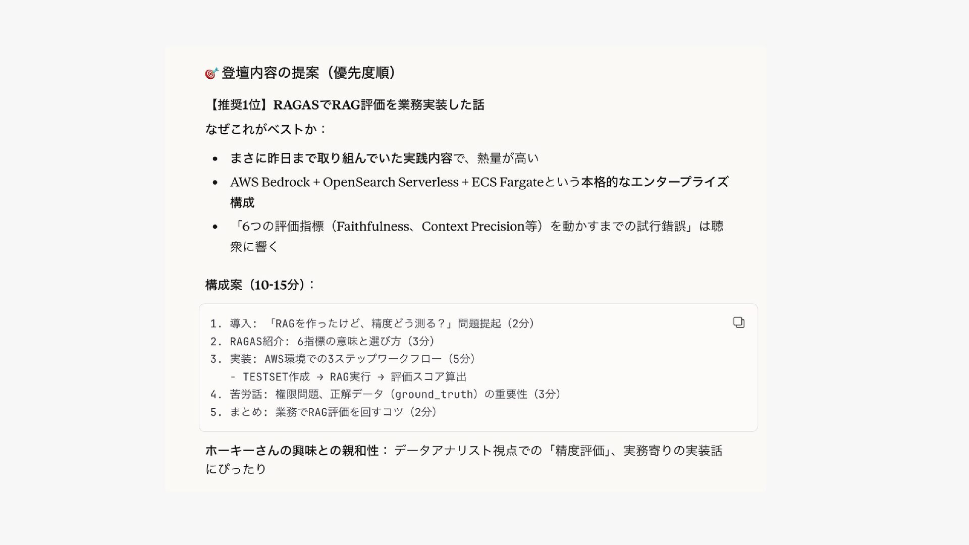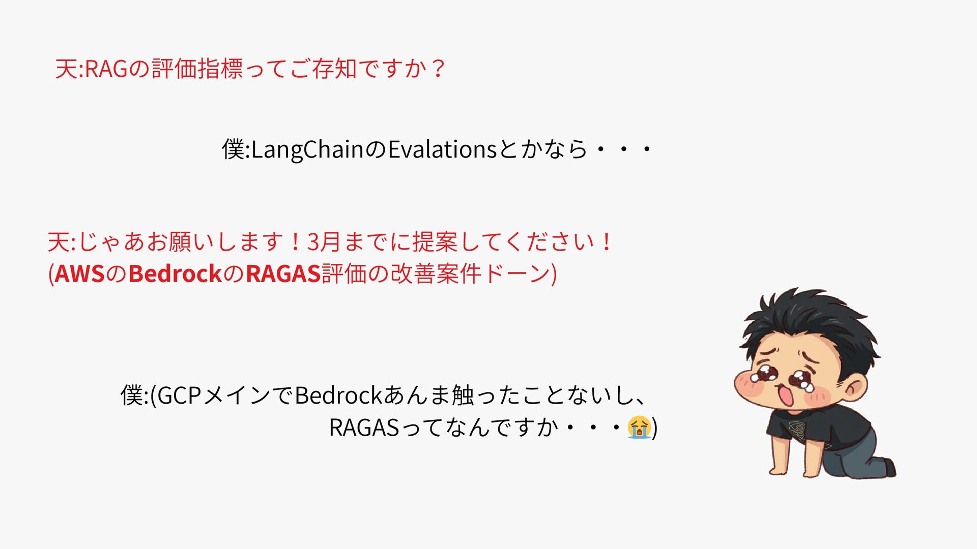 天:RAGの評価指標ってご存知ですか? 僕:LangChainのEvalationsとかなら・・・ 天:じゃあお願いします!3月までに提案してください! (AWSのBedrockのRAGAS評価の改善案件ドーン) 僕:(GCPメインでBedrockあんま触ったことないし、 RAGASってなんですか・・・ 😭)