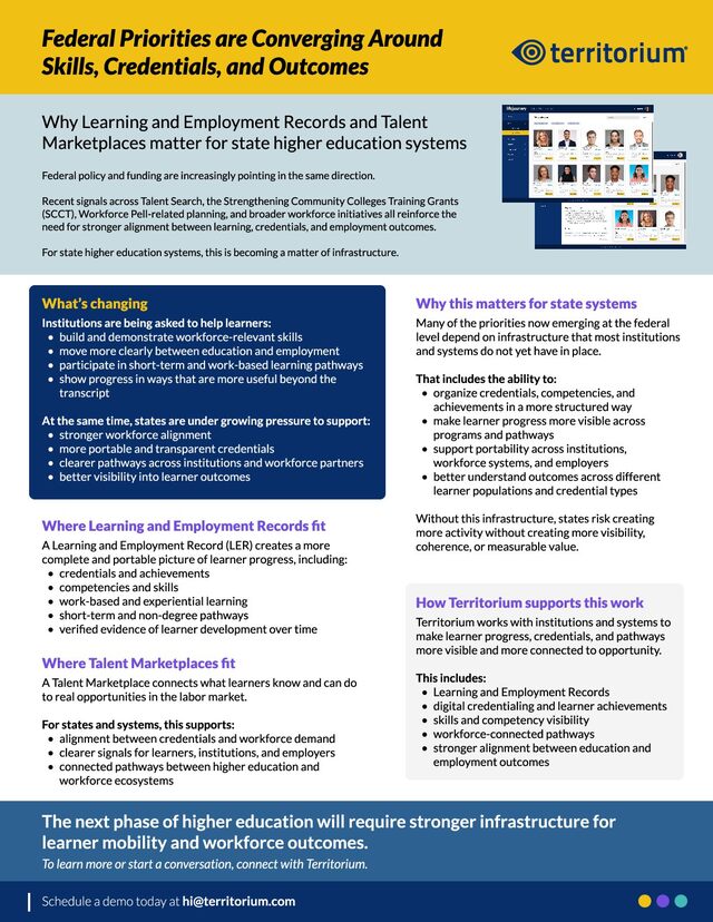 ederal policy is creating new pressure and new opportunity for states to strengthen the infrastructure connecting education and employment. Across the U.S. Department of Education and U.S. Department of Labor, the direction is increasingly clear: make skills visible, make credentials portable, and make outcomes measurable.