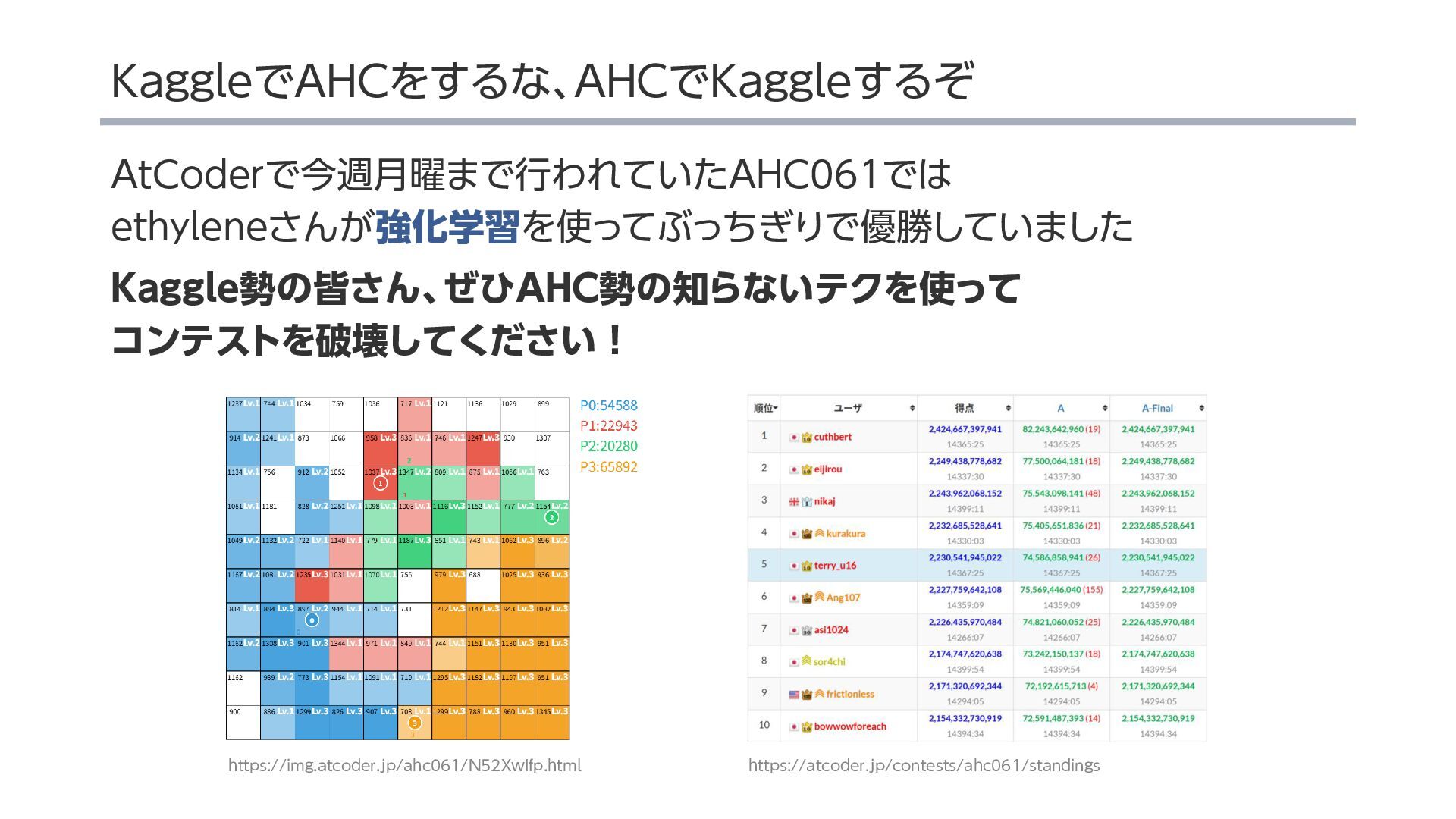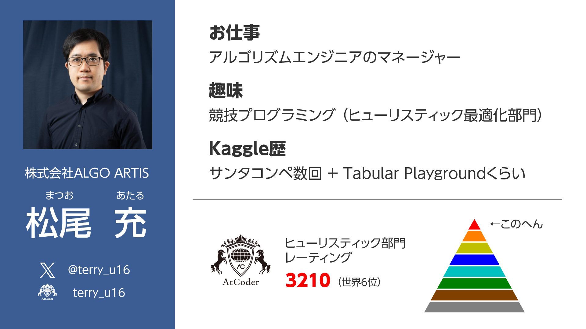 @terry_u16 terry_u16 ←このへん お仕事 アルゴリズムエンジニアのマネージャー 趣味 競技プログラミング (ヒューリスティック最適化部門) Kaggle歴 サンタコンペ数回 + Tabular Playgroundくらい