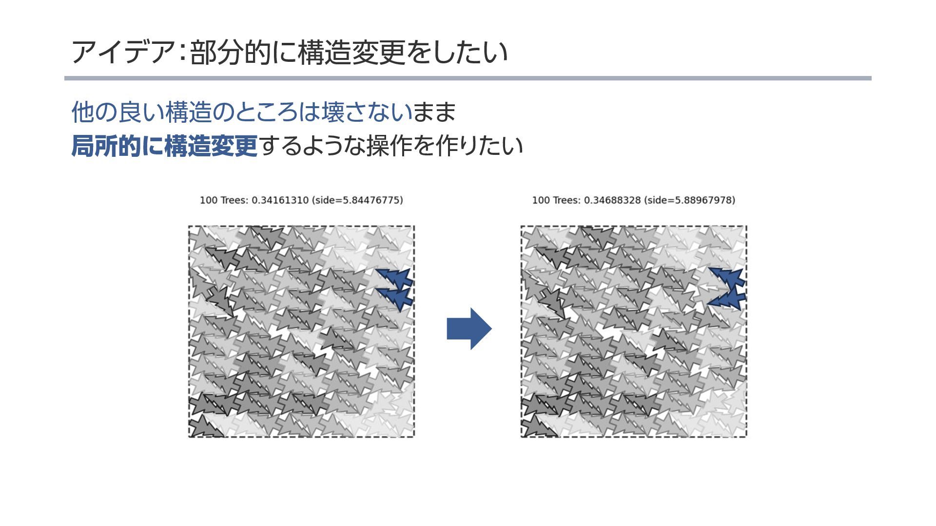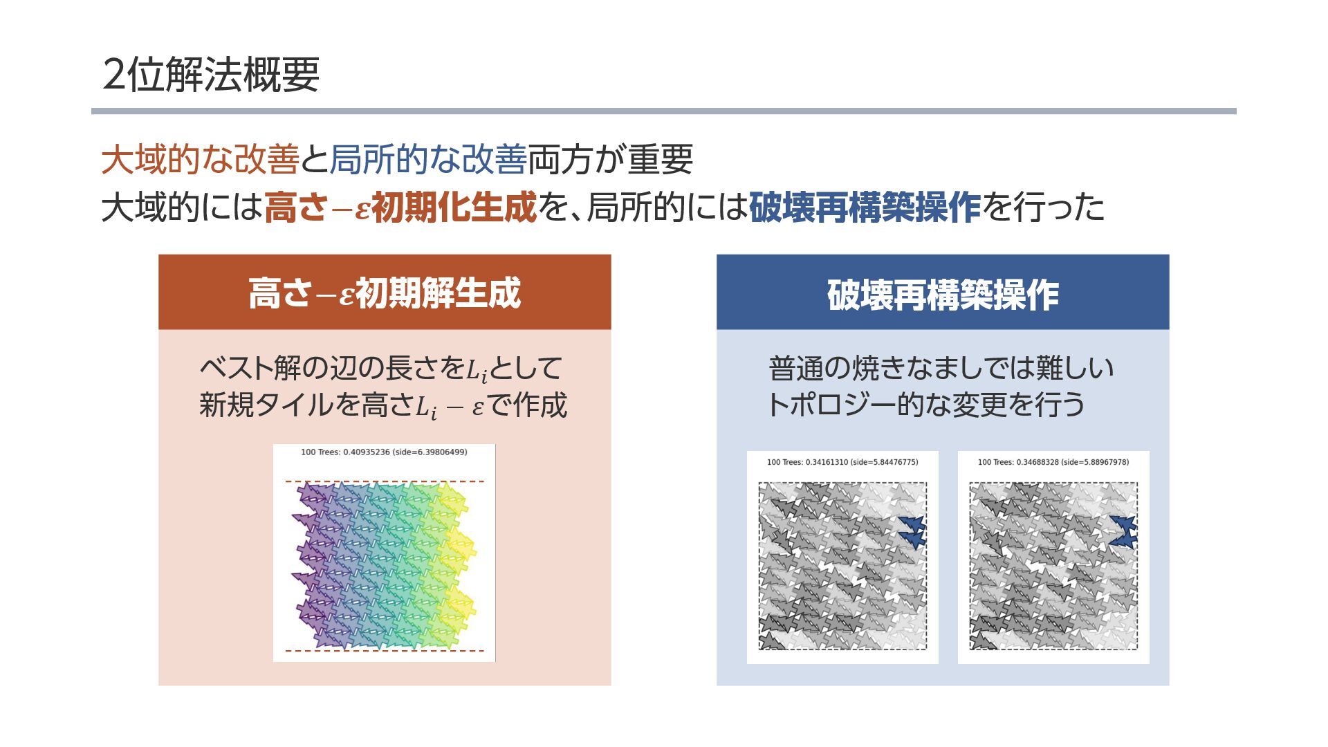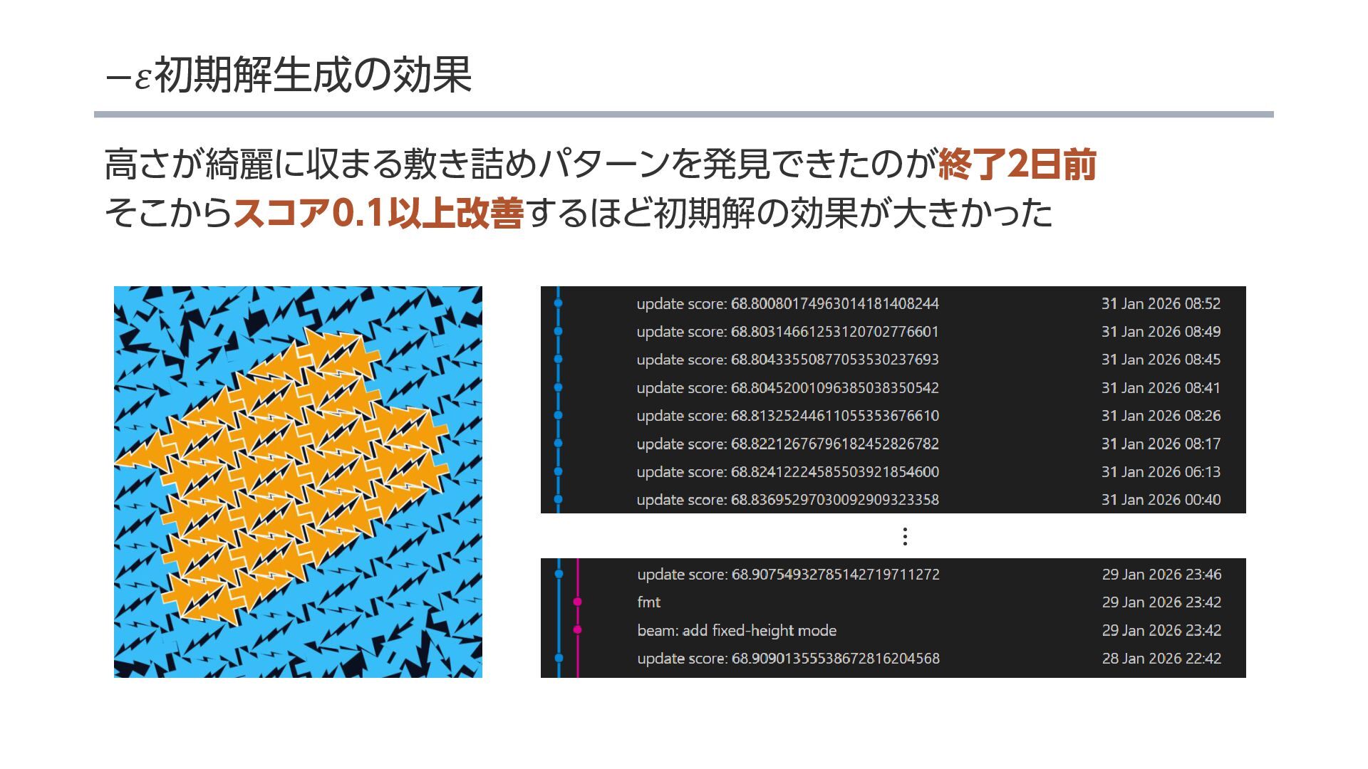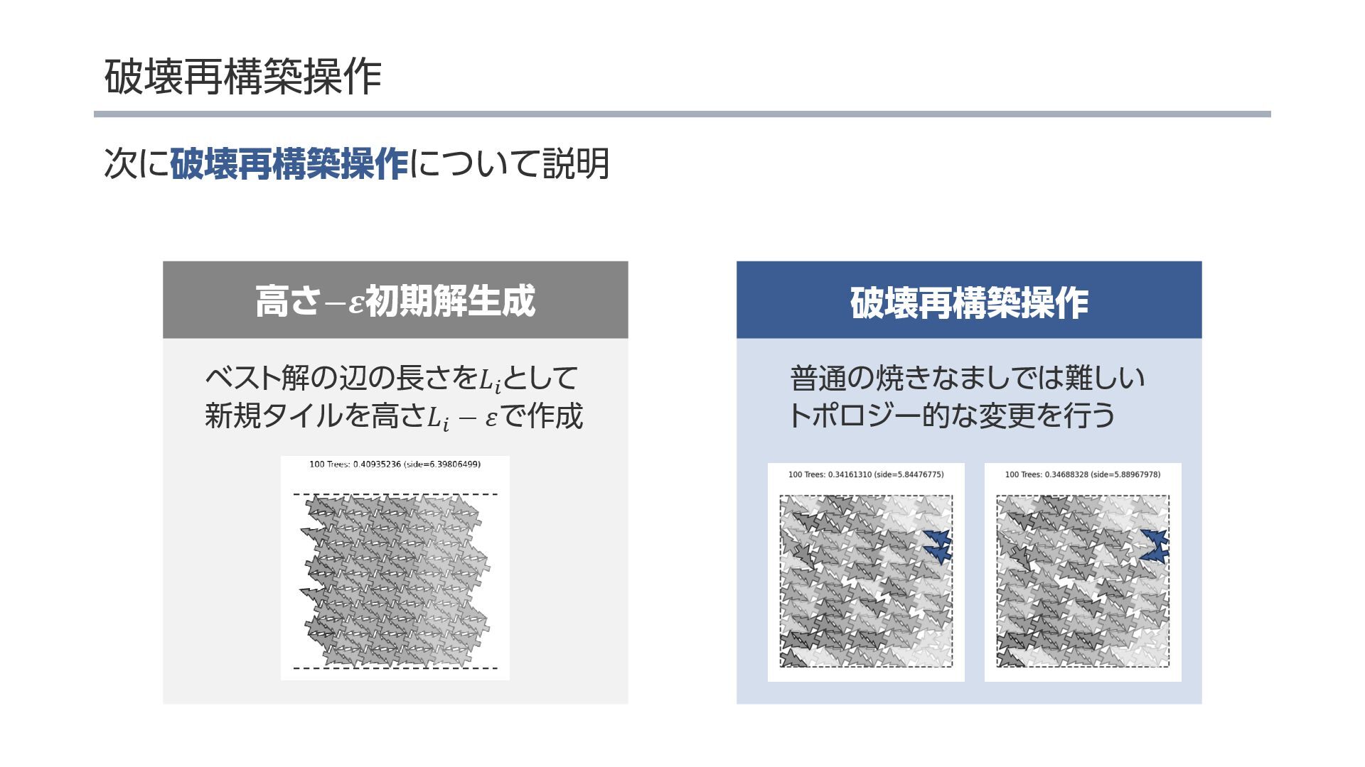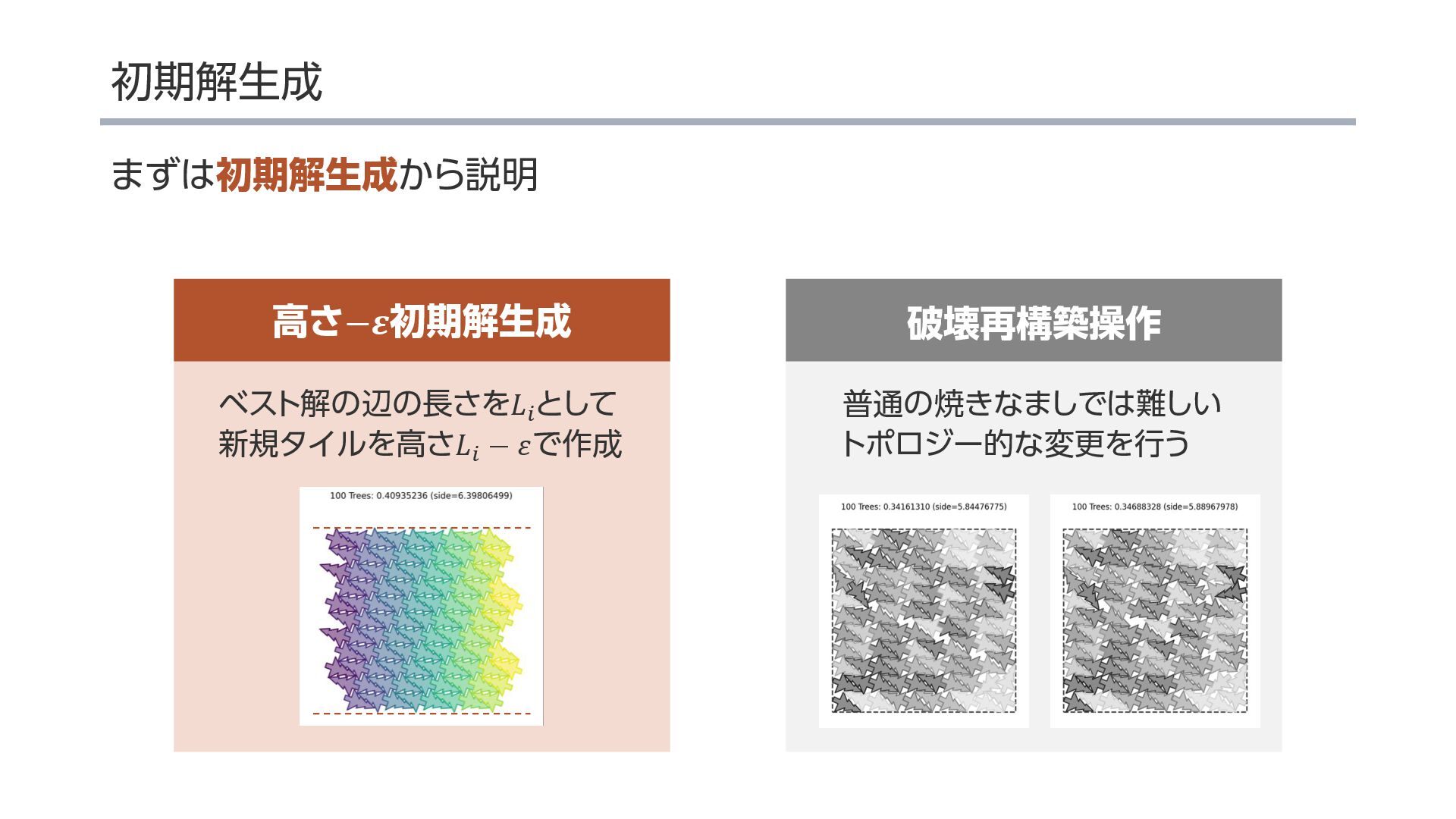 2. 初期解生成 高さと幅を同時に縮めるのではなく、高さ固定の問題として取り扱う ベスト解の辺の長さを𝐿𝑖 として、高さを 𝐿𝑖 − 𝜀 で固定して解く 𝐿𝑖 −
