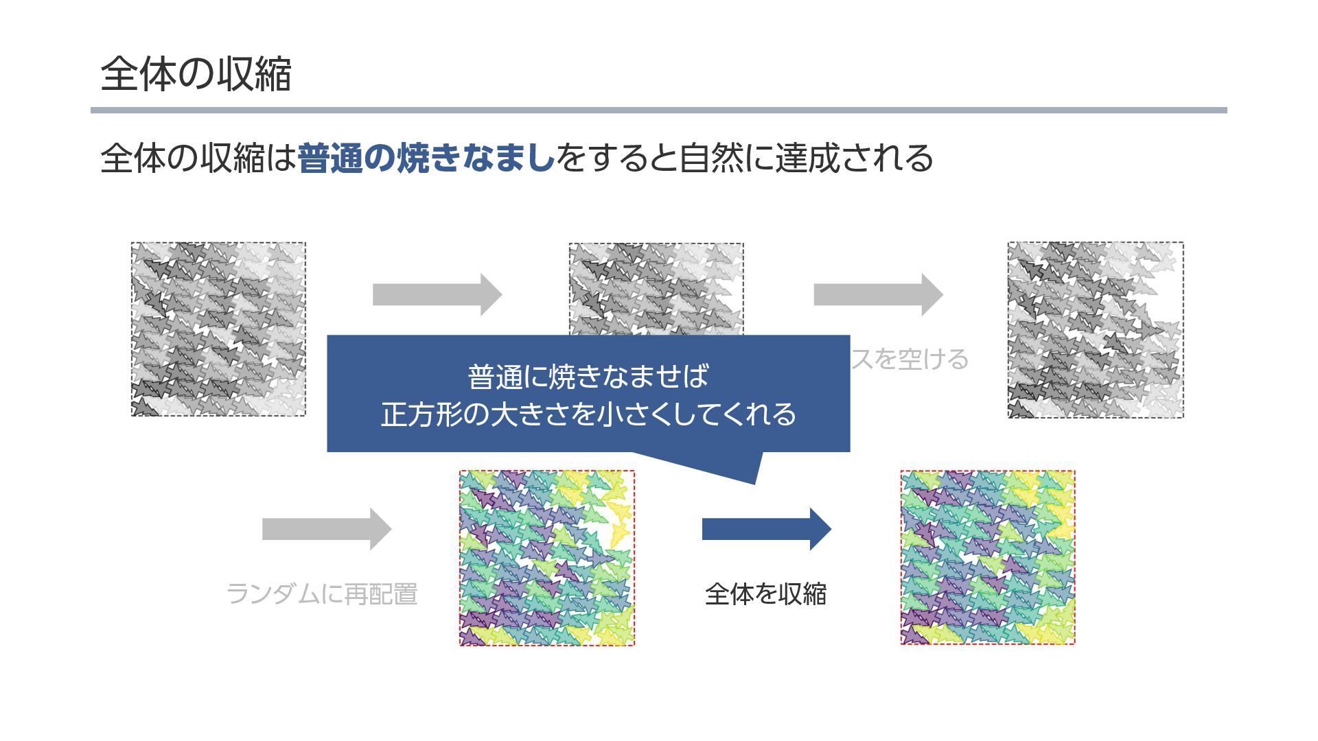 𝜀 嬉しいこと 縦と横を同時に縮めるのは難しいが 横だけを縮める問題と捉えることができる 左右をそれぞれをいい感じに揃えればよいので 実質的な問題サイズが半分になる 上下の辺部分の形が崩れにくい