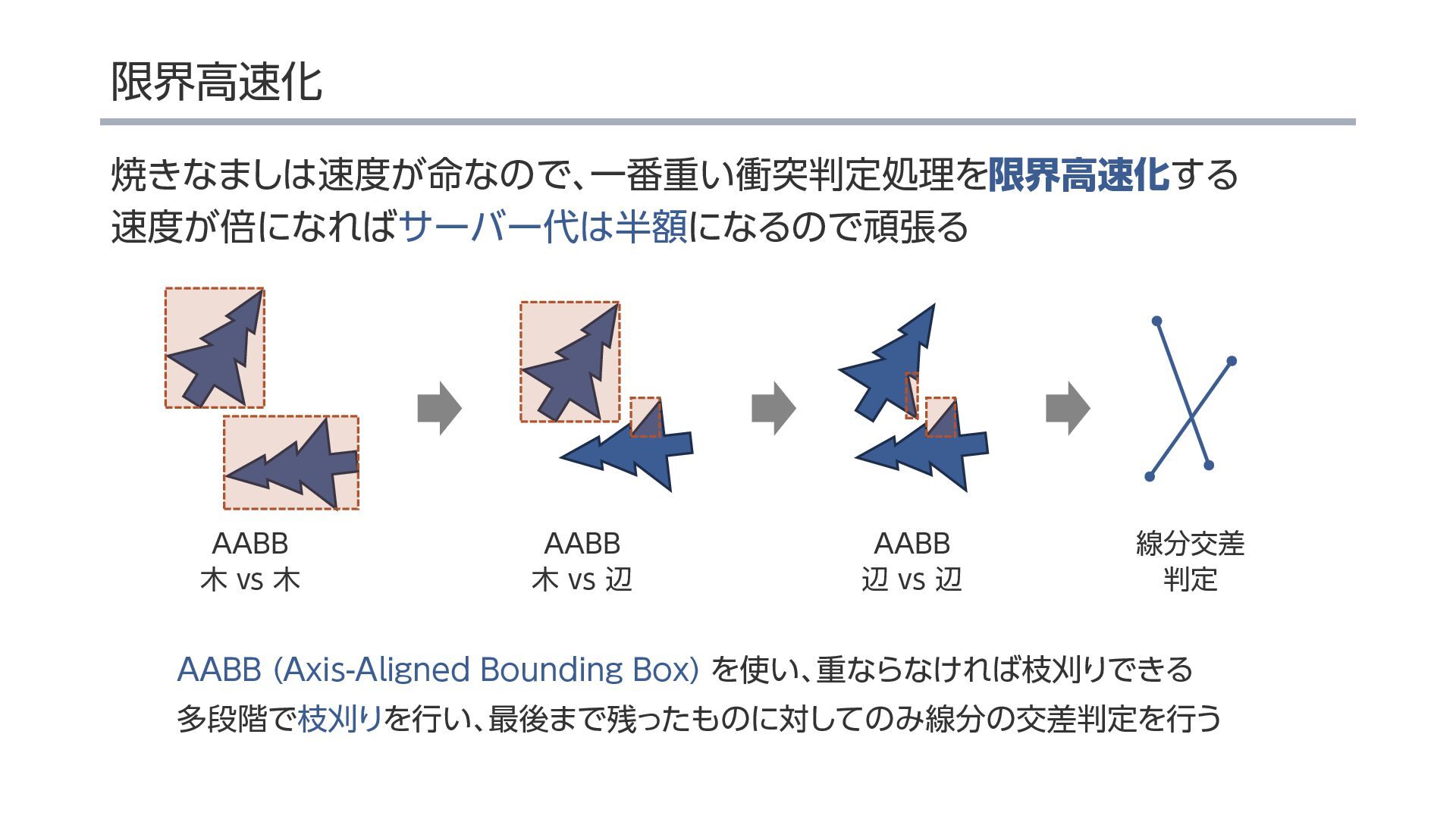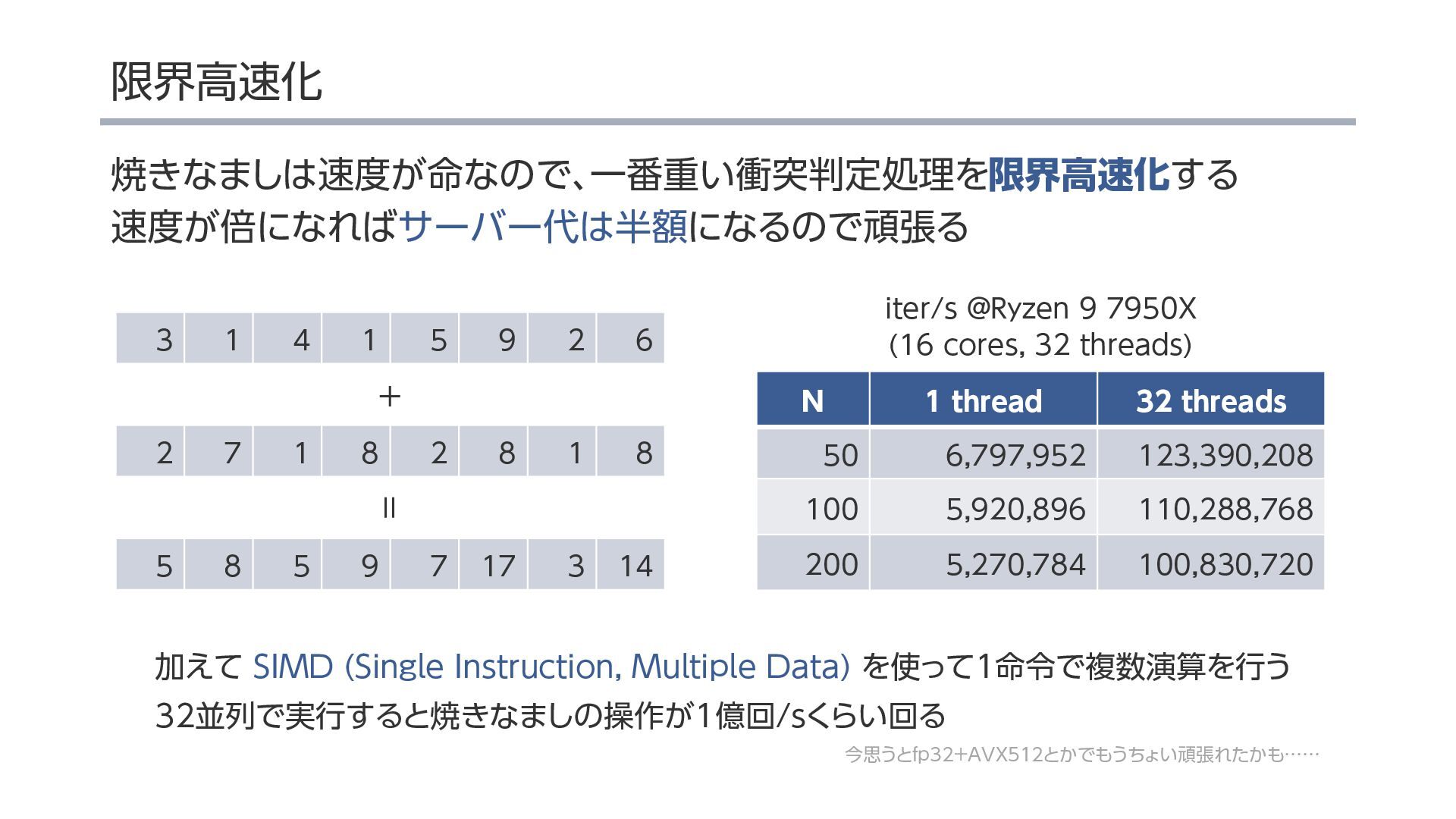 4. 限界高速化 焼きなましは速度が命なので、一番重い衝突判定処理を限界高速化する 速度が倍になればサーバー代は半額になるので頑張る 加えて SIMD (Single Instruction, Multiple Data) を使って1命令で複数演算を行う