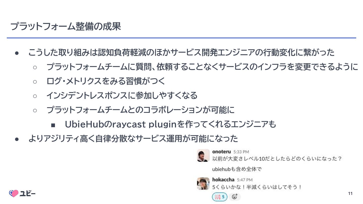 ◦ プラットフォームチームとのコラボレーションが可能に ▪ UbieHubのraycast pluginを作ってくれるエンジニアも • よりアジリティ高く自律分散なサービス運用が可能になった
