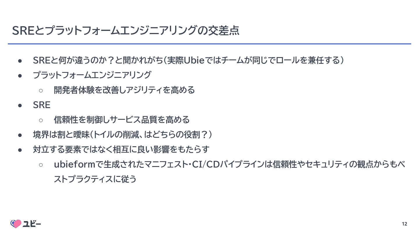 ◦ 信頼性を制御しサービス品質を高める • 境界は割と曖昧(トイルの削減、はどちらの役割?) • 対立する要素ではなく相互に良い影響をもたらす ◦ ubieformで生成されたマニフェスト・CI/CDパイプラインは信頼性やセキュリティの観点からもベ ストプラクティスに従う
