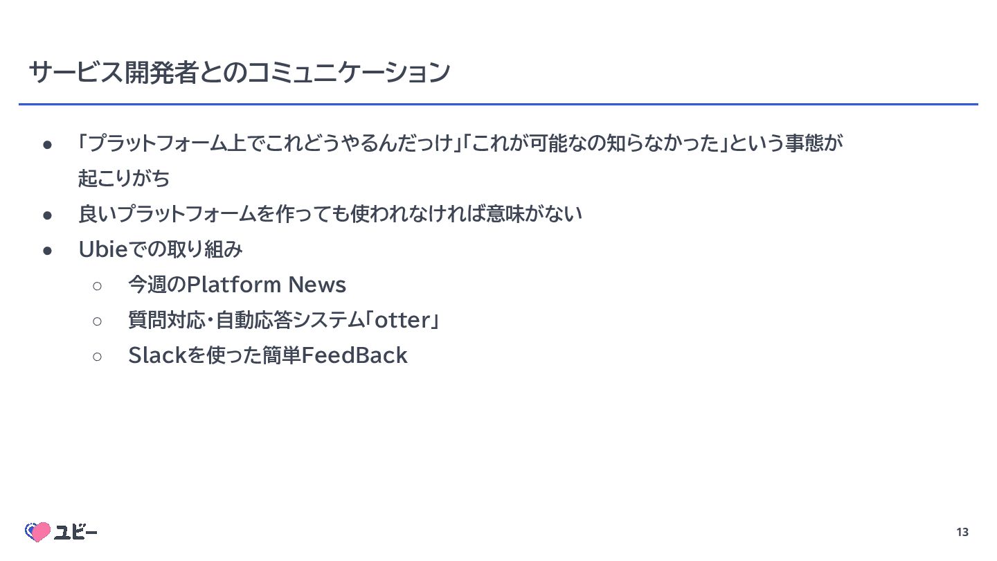 13 サービス開発者とのコミュニケーション • 「プラットフォーム上でこれどうやるんだっけ」「これが可能なの知らなかった」という事態が 起こりがち • 良いプラットフォームを作っても使われなければ意味がない • Ubieでの取り組み ◦
