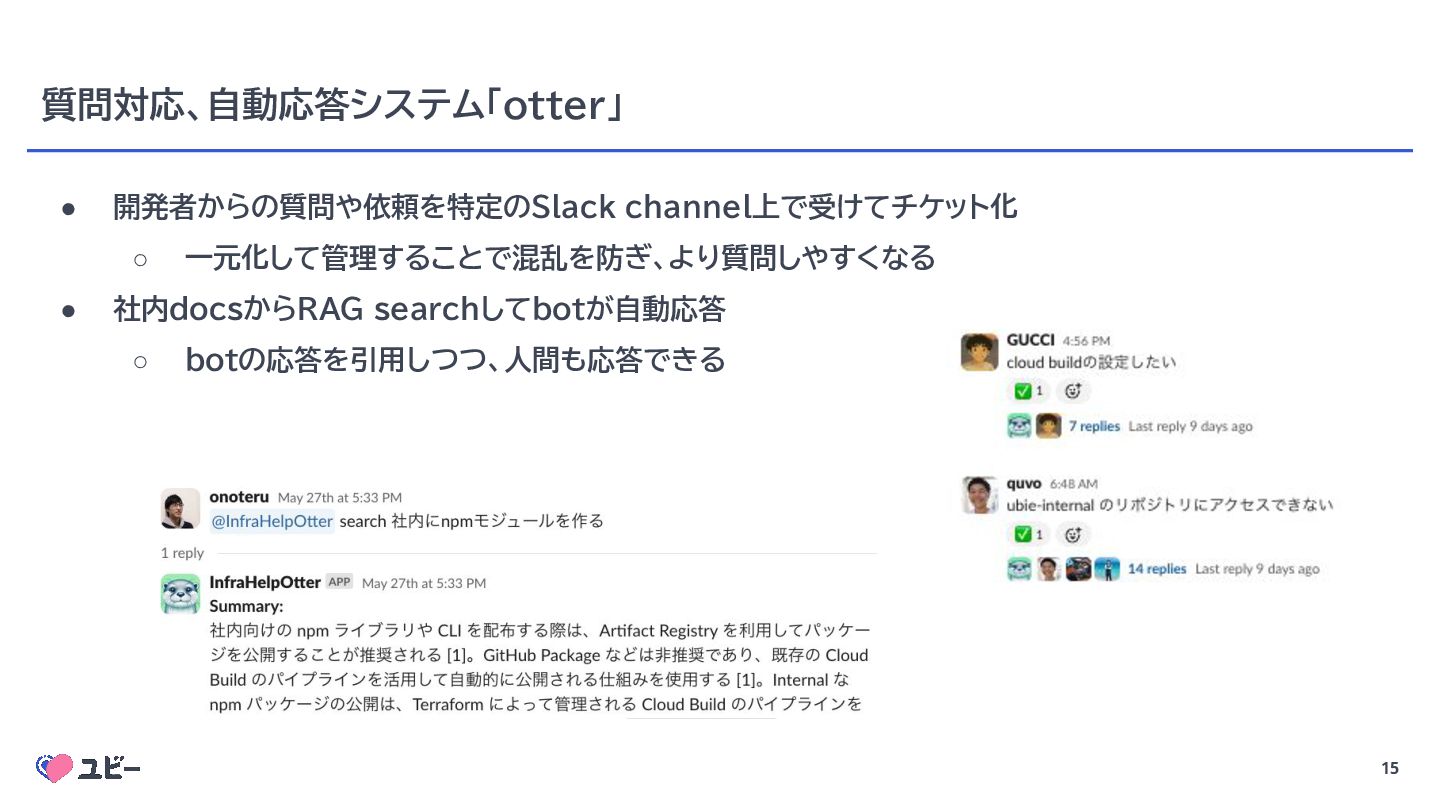 15 質問対応、自動応答システム「otter」 • 開発者からの質問や依頼を特定のSlack channel上で受けてチケット化 ◦ 一元化して管理することで混乱を防ぎ、より質問しやすくなる • 社内docsからRAG searchしてbotが自動応答