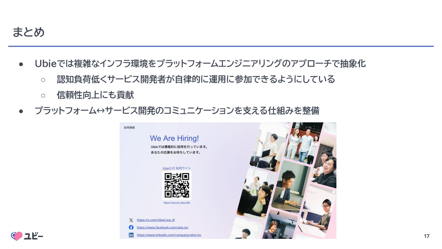17 まとめ • Ubieでは複雑なインフラ環境をプラットフォームエンジニアリングのアプローチで抽象化 ◦ 認知負荷低くサービス開発者が自律的に運用に参加できるようにしている ◦ 信頼性向上にも貢献 • プラットフォーム↔サービス開発のコミュニケーションを支える仕組みを整備