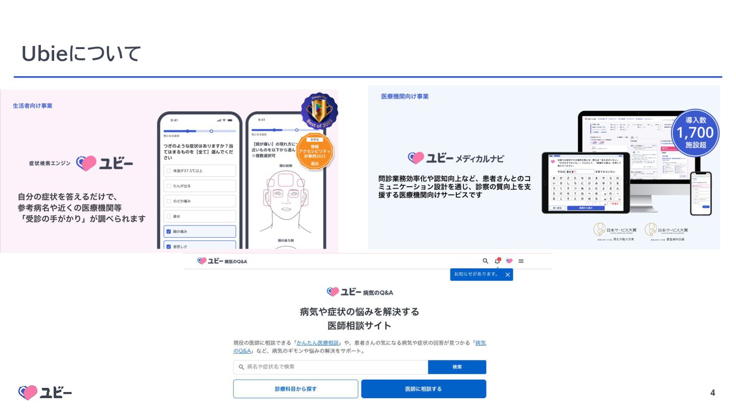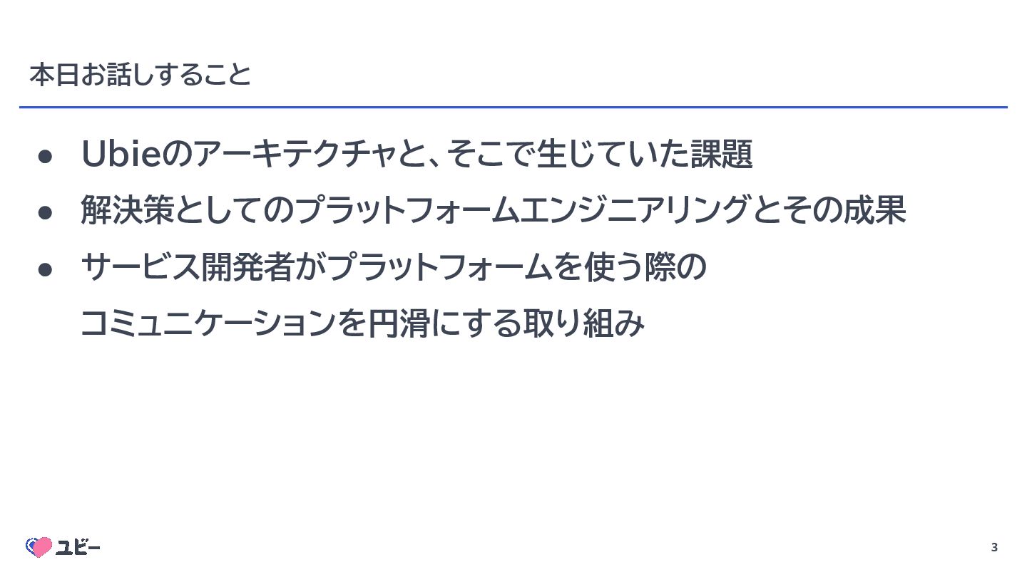 3 本日お話しすること • Ubieのアーキテクチャと、そこで生じていた課題 • 解決策としてのプラットフォームエンジニアリングとその成果 • サービス開発者がプラットフォームを使う際の コミュニケーションを円滑にする取り組み