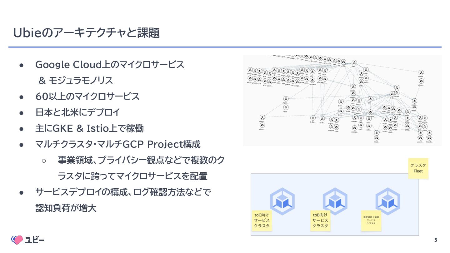 日本と北米にデプロイ • 主にGKE & Istio上で稼働 • マルチクラスタ・マルチGCP Project構成 ◦ 事業領域、プライバシー観点などで複数のク ラスタに跨ってマイクロサービスを配置 • サービスデプロイの構成、ログ確認方法などで 認知負荷が増大
