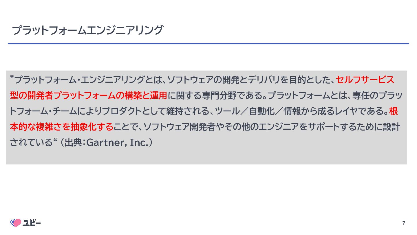 6 プラットフォームエンジニアリング ”プラットフォーム・エンジニアリングとは、ソフトウェアの開発とデリバリを目的とした、セルフサービス 型の開発者プラットフォームの構築と運用に関する専門分野である。プラットフォームとは、専任のプラッ トフォーム・チームによりプロダクトとして維持される、ツール/自動化/情報から成るレイヤである。根 本的な複雑さを抽象化することで、ソフトウェア開発者やその他のエンジニアをサポートするために設計 されている“ (出典:Gartner, Inc.)