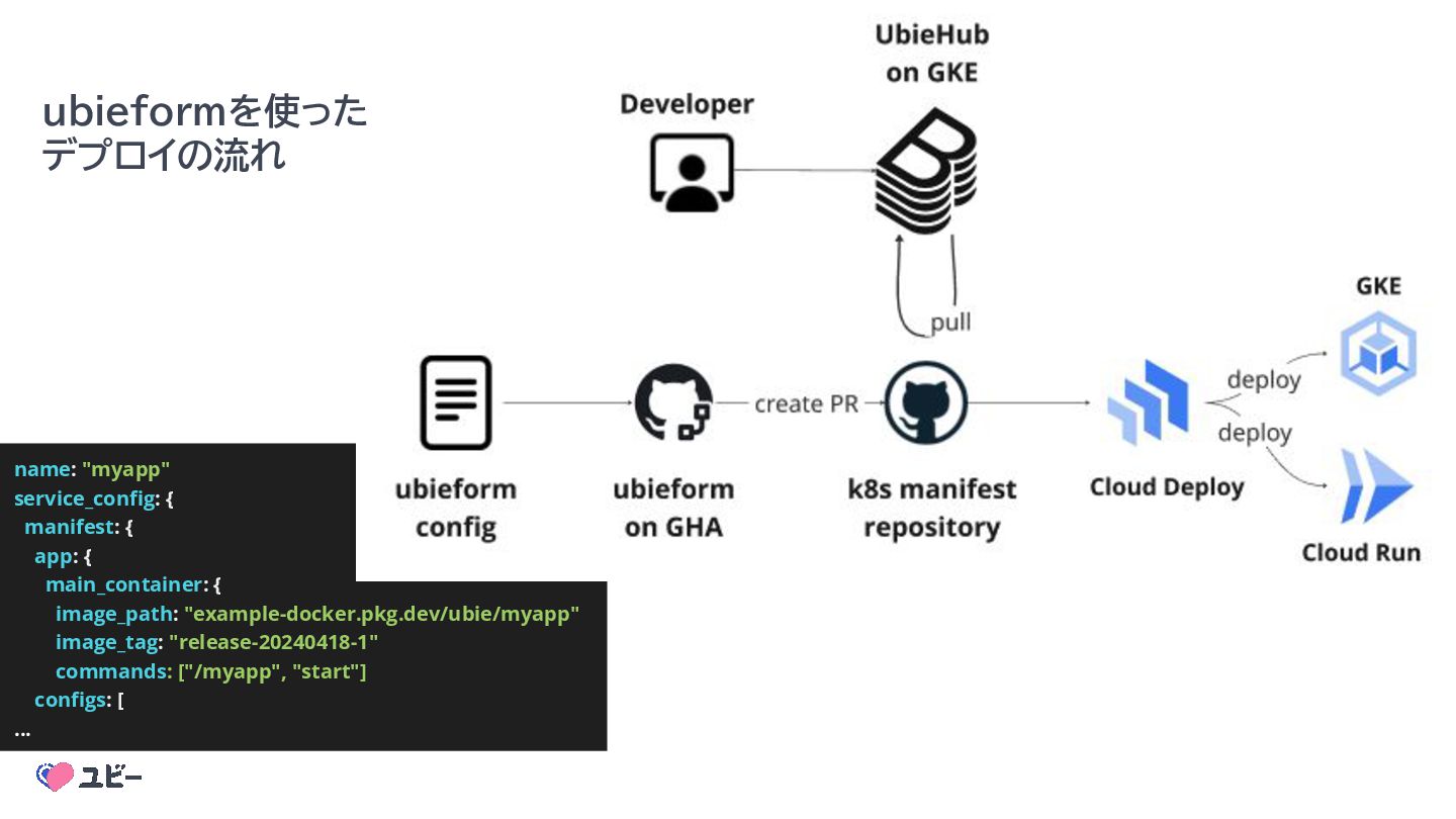 { image_path: "example-docker.pkg.dev/ubie/myapp" image_tag: "release-20240418-1" commands: ["/myapp", "start"] configs: [ … ubieformを使った デプロイの流れ