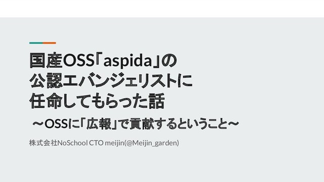 国産OSS「aspida」の 公認エバンジェリストに 任命してもらった話 株式会社NoSchool CTO meijin(@Meijin_garden) 〜OSSに「広報」で貢献するということ〜