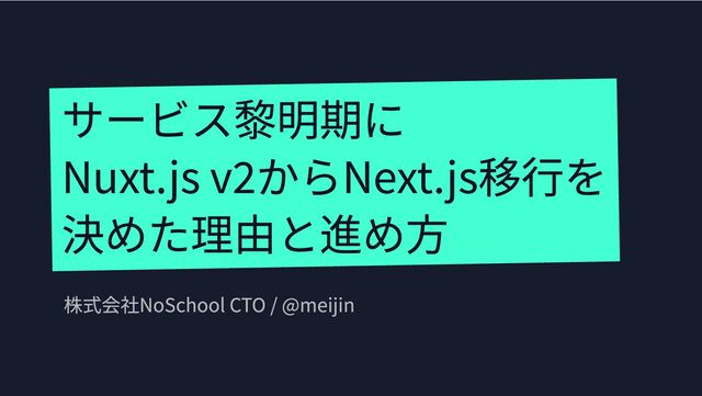 株式会社NoSchool CTO / @meijin サービス黎明期に Nuxt.js v2からNext.js移行を 決めた理由と進め方