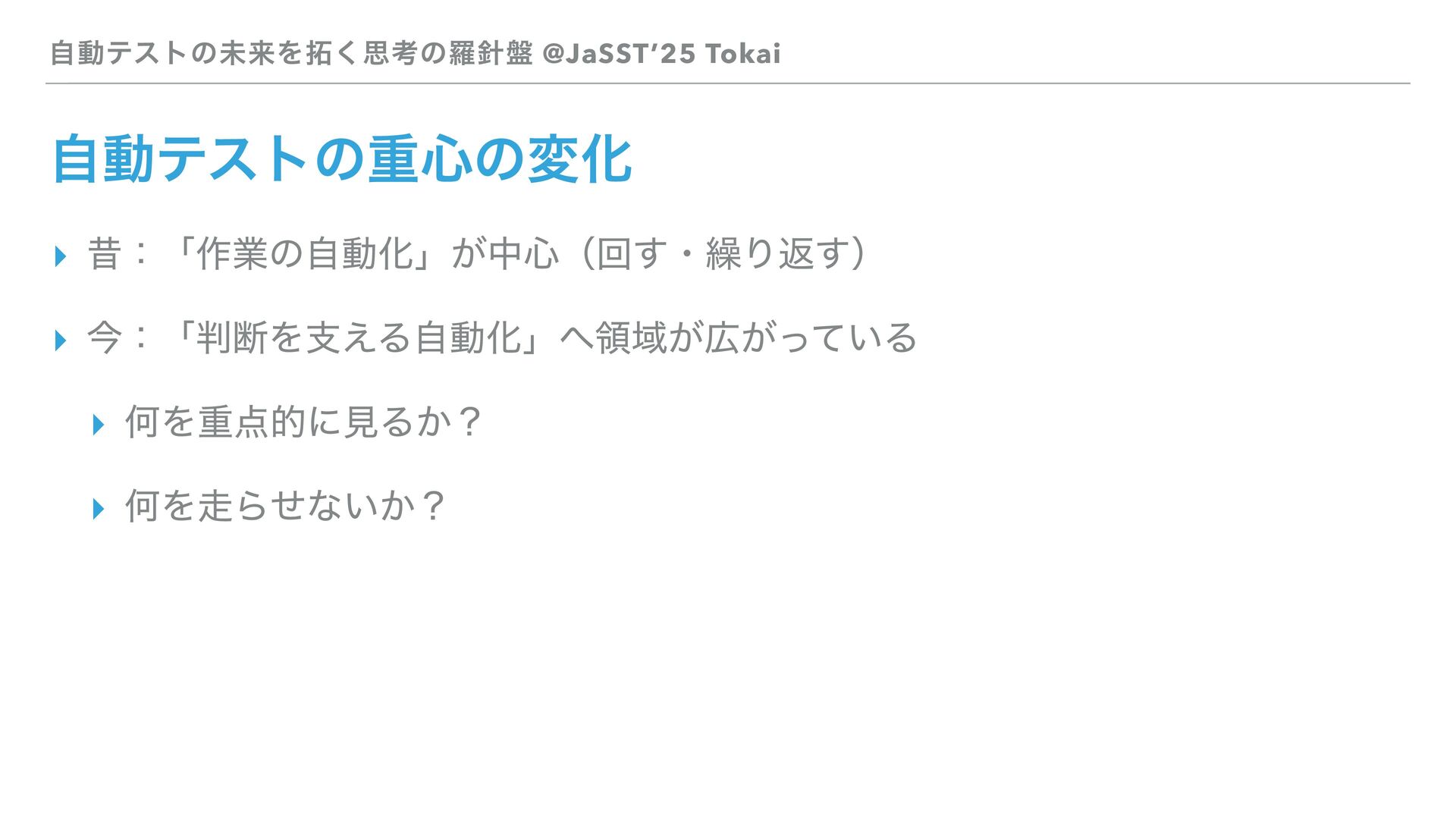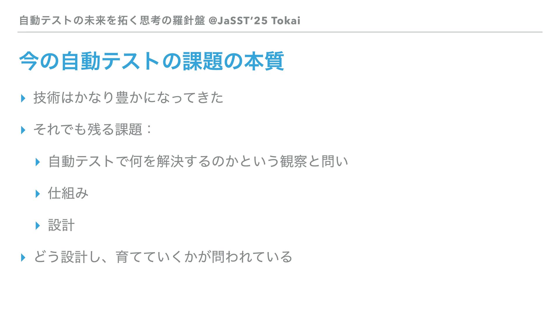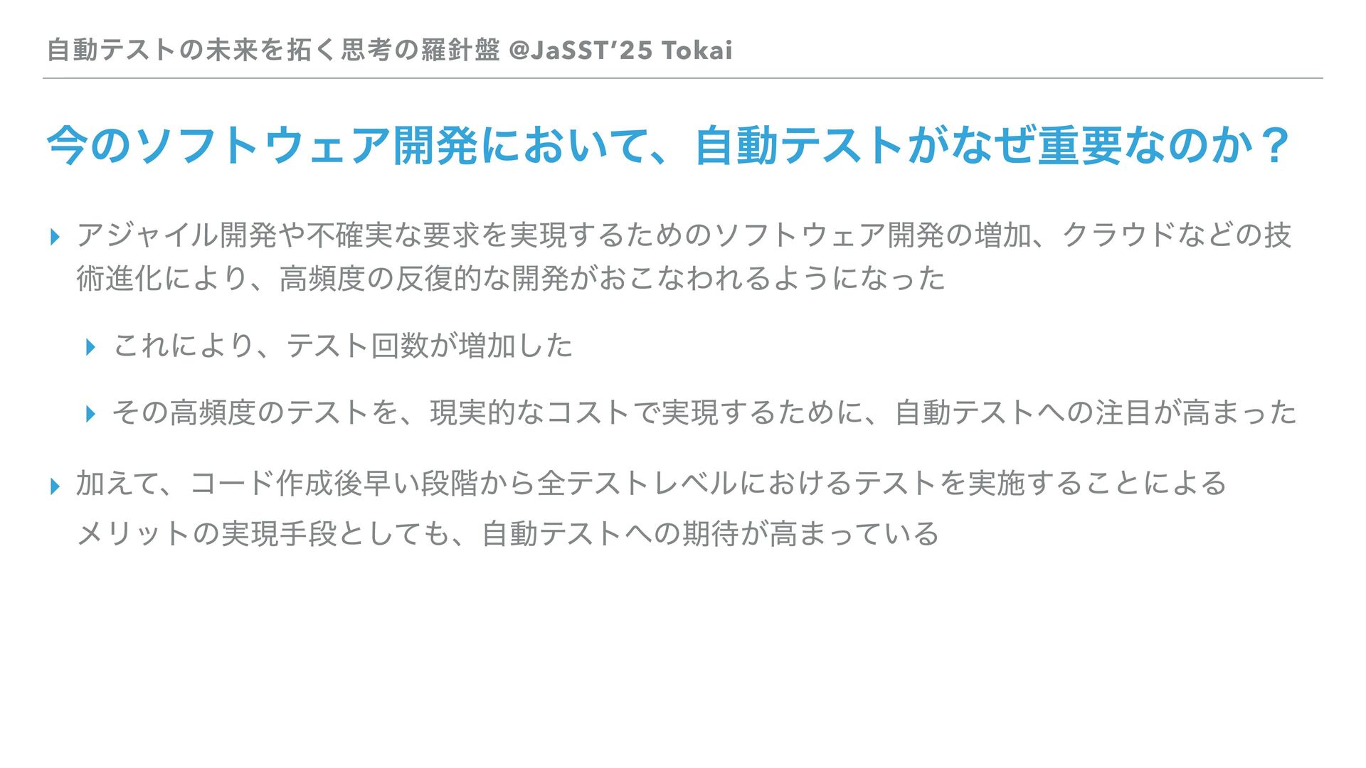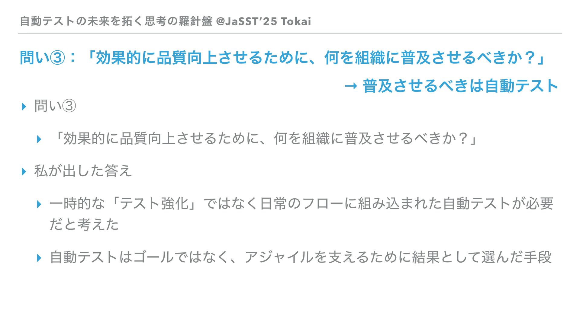 6. ࣗಈςετͷະདྷΛ୓͘ࢥߟͷཏ਑൫ @JaSST’25 Tokai ໰͍ᶅɿʮޮՌతʹ඼࣭޲্ͤ͞ΔͨΊʹɺԿΛ૊৫ʹීٴͤ͞Δ΂͖͔ʁʯ ɹɹɹɹɹɹɹɹɹɹɹɹɹɹɹɹɹɹɹɹɹ → ීٴͤ͞Δ΂͖͸ࣗಈςετ ▸ ໰͍ᶅ ▸
