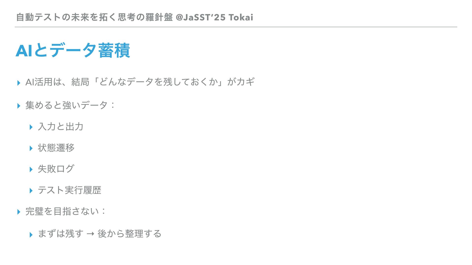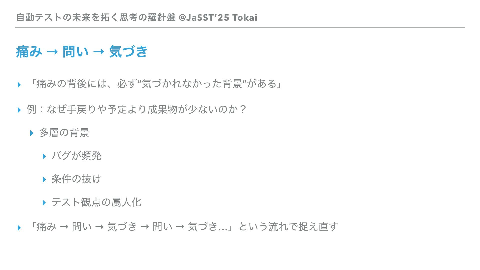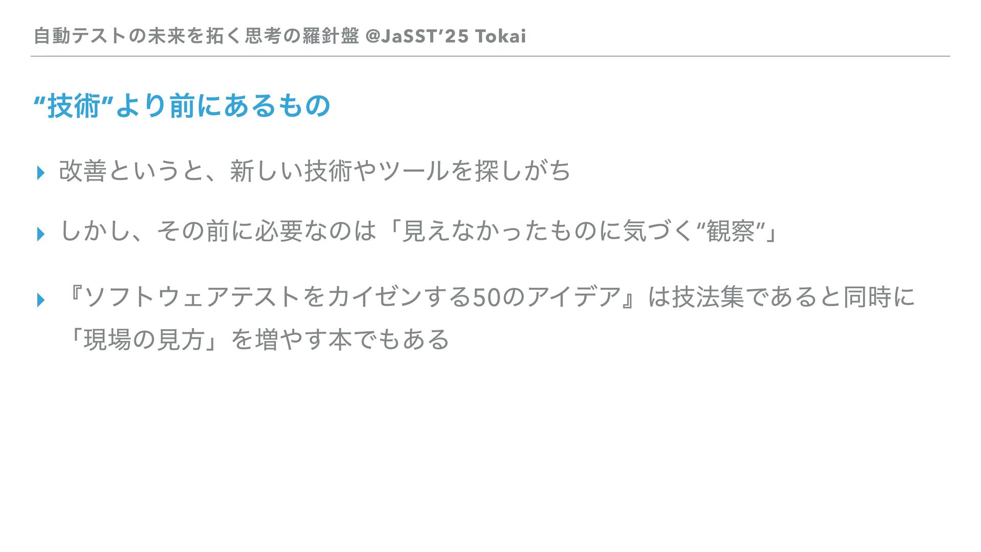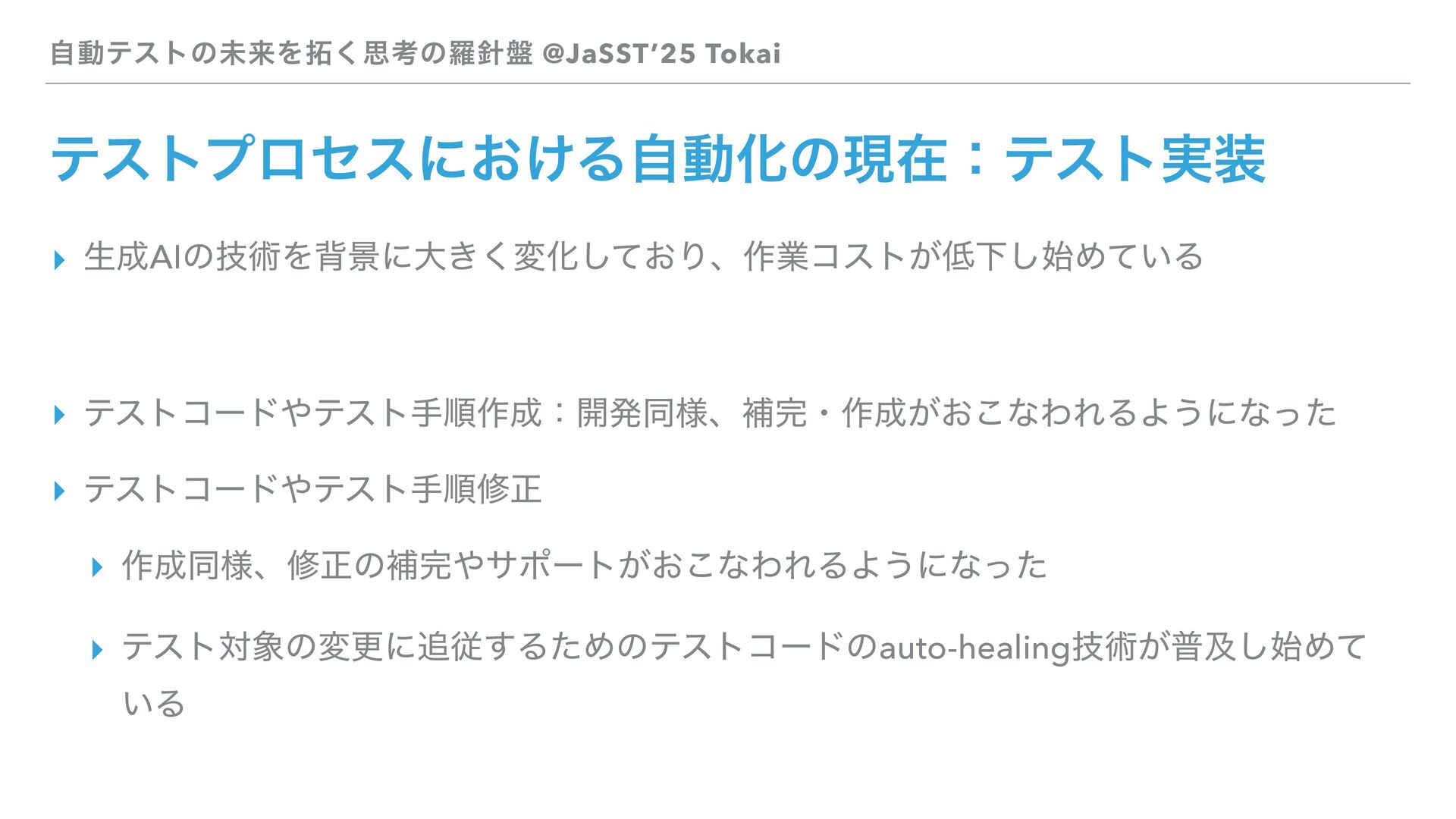 6. ࣗಈςετͷະདྷΛ୓͘ࢥߟͷཏ਑൫ @JaSST’25 Tokai ໰͍ᶅɿʮޮՌతʹ඼࣭޲্ͤ͞ΔͨΊʹɺԿΛ૊৫ʹීٴͤ͞Δ΂͖͔ʁʯ ɹɹɹɹɹɹɹɹɹɹɹɹɹɹɹɹɹɹɹɹɹ → ීٴͤ͞Δ΂͖͸ࣗಈςετ ▸ ໰͍ᶅ ▸