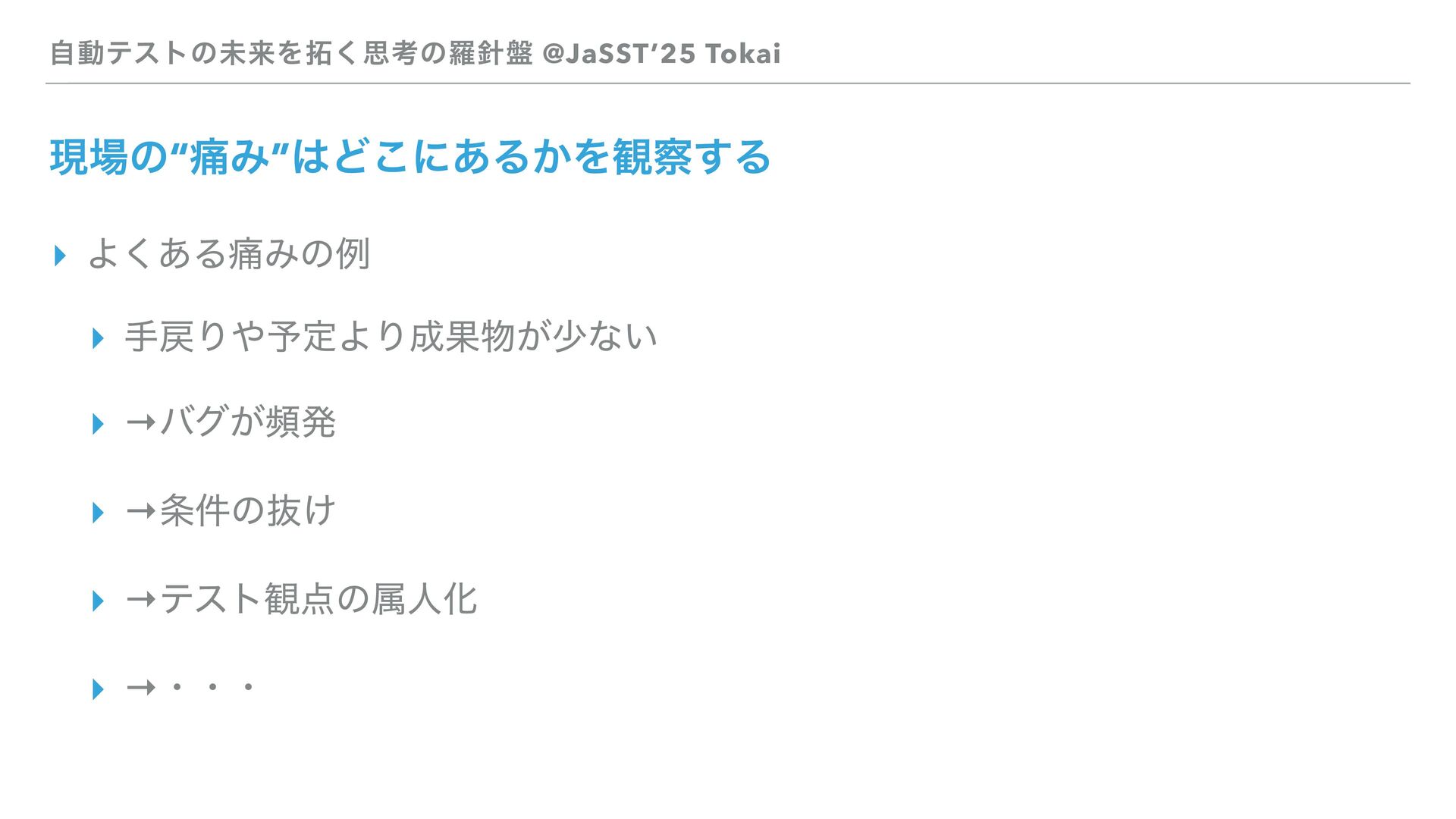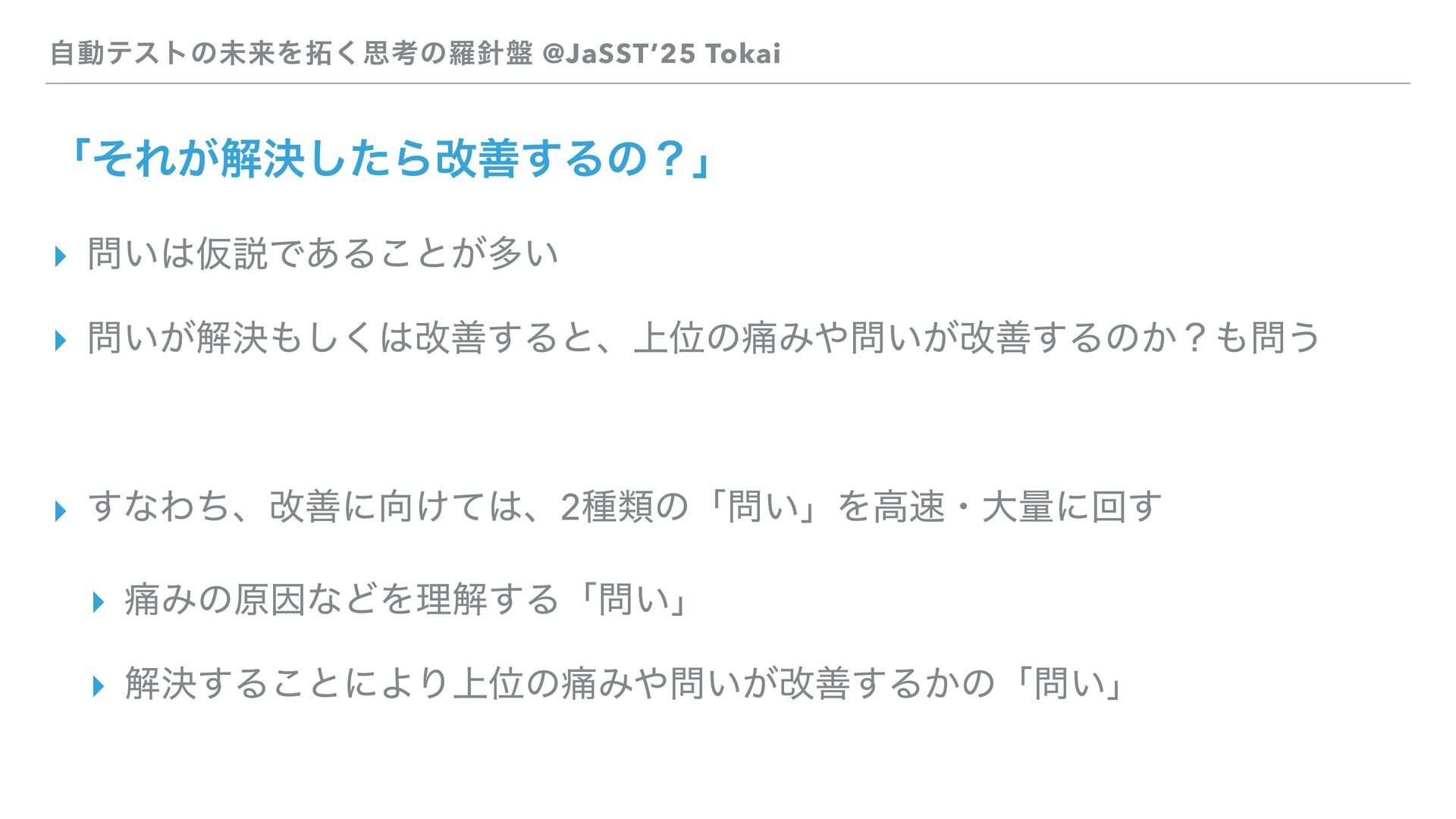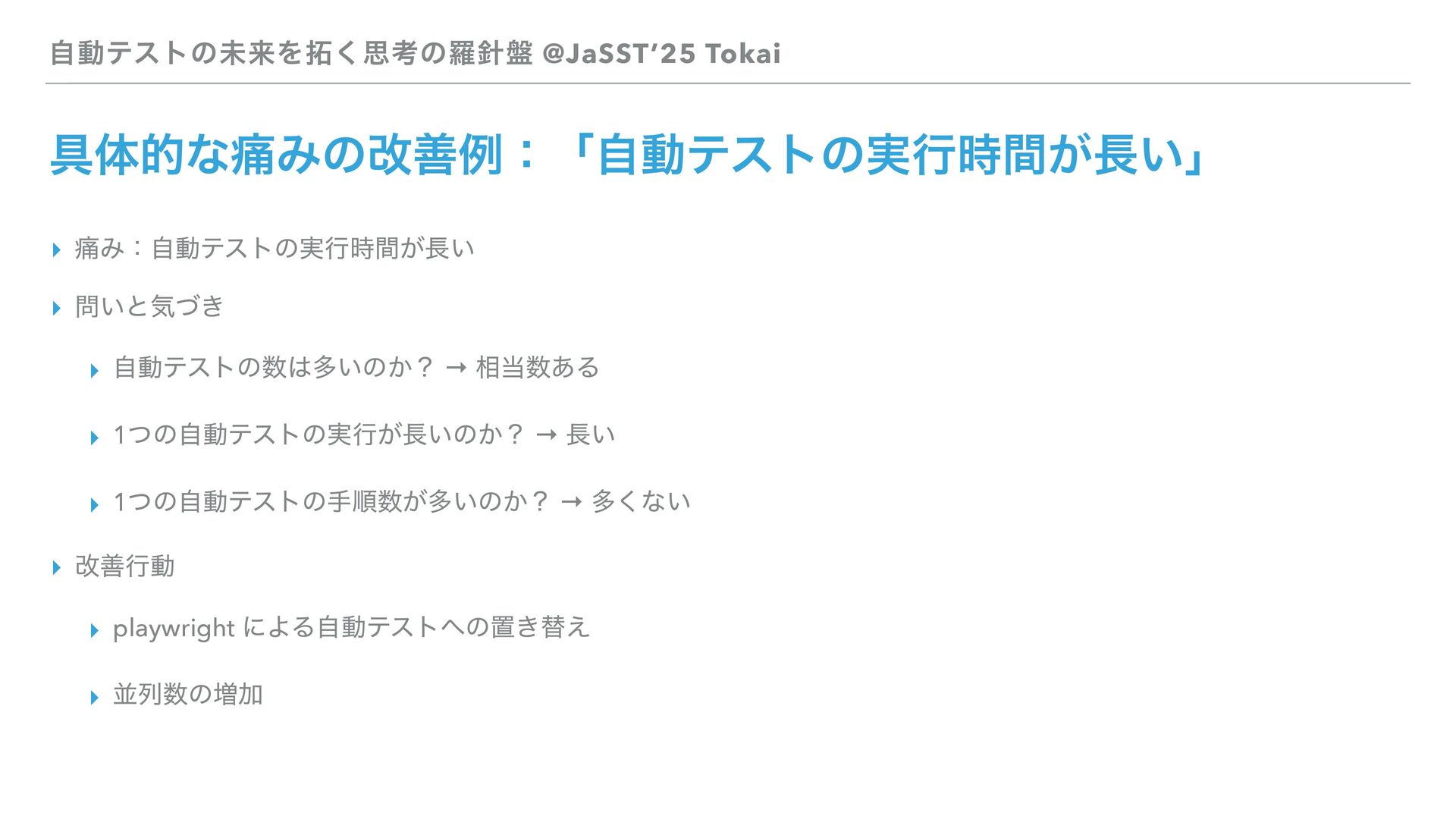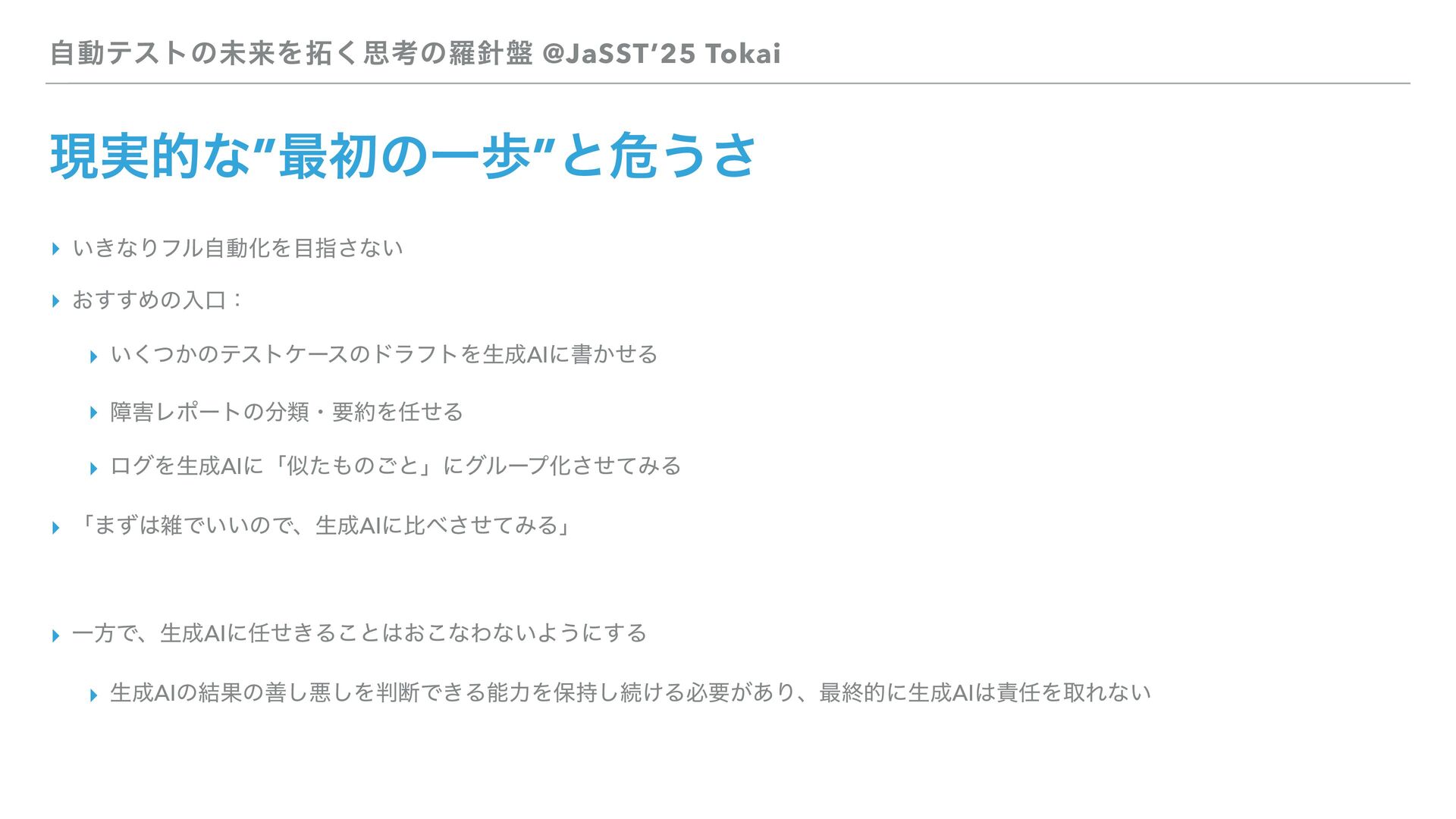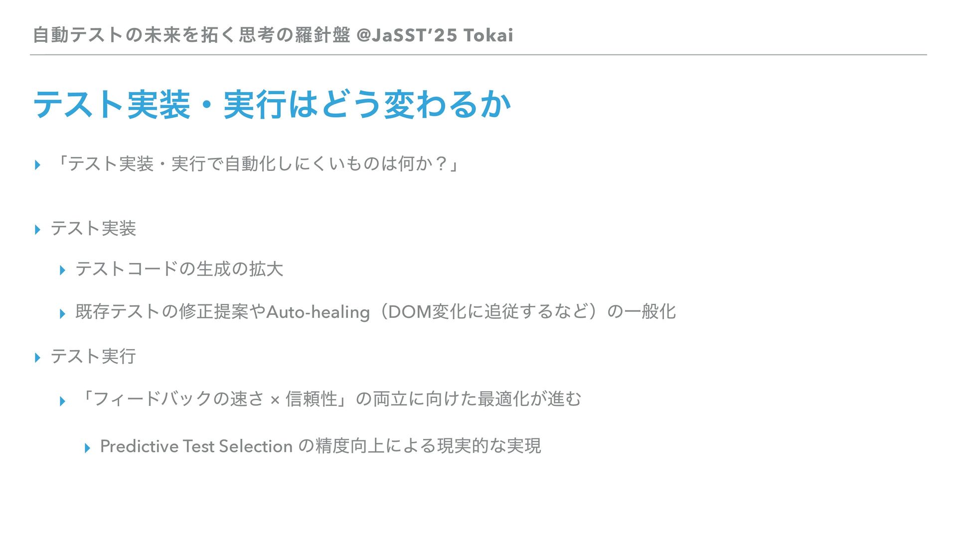6. ࣗಈςετͷະདྷΛ୓͘ࢥߟͷཏ਑൫ @JaSST’25 Tokai ໰͍ᶅɿʮޮՌతʹ඼࣭޲্ͤ͞ΔͨΊʹɺԿΛ૊৫ʹීٴͤ͞Δ΂͖͔ʁʯ ɹɹɹɹɹɹɹɹɹɹɹɹɹɹɹɹɹɹɹɹɹ → ීٴͤ͞Δ΂͖͸ࣗಈςετ ▸ ໰͍ᶅ ▸
