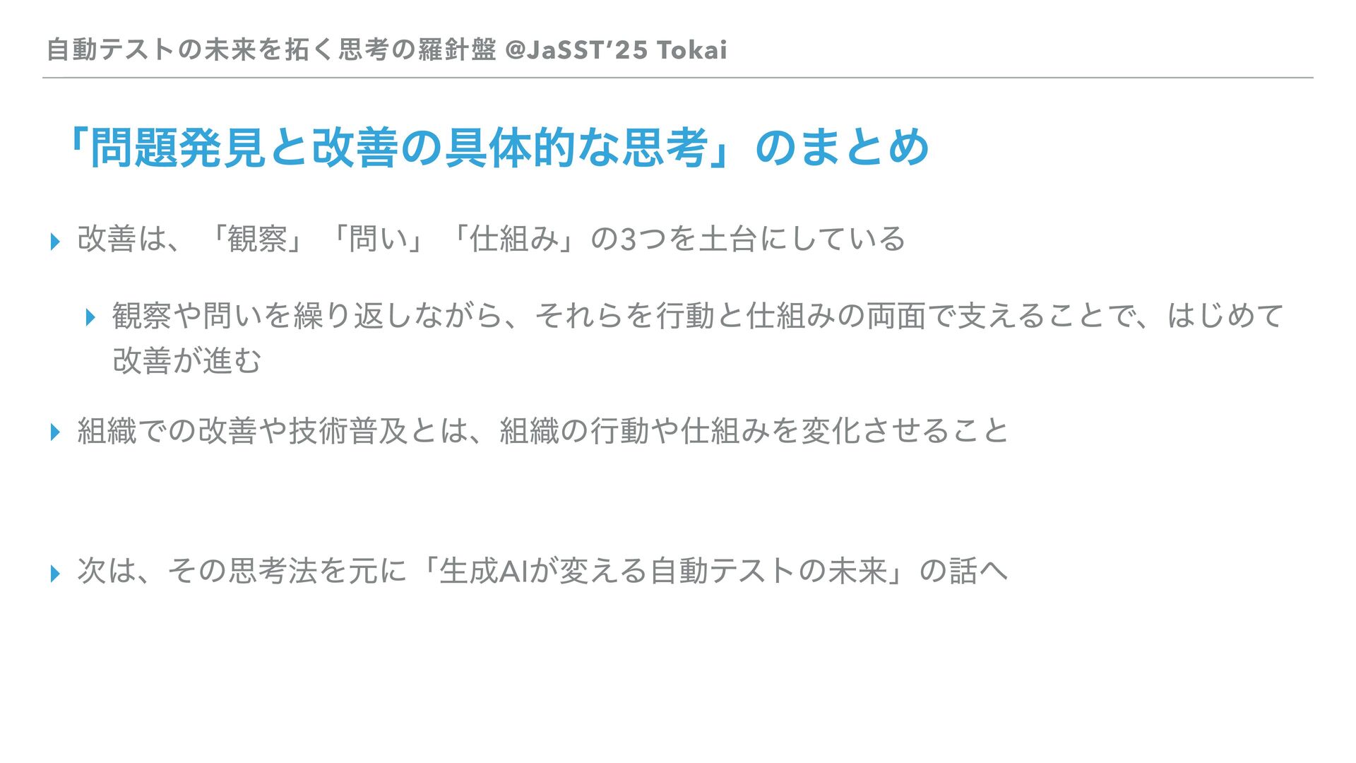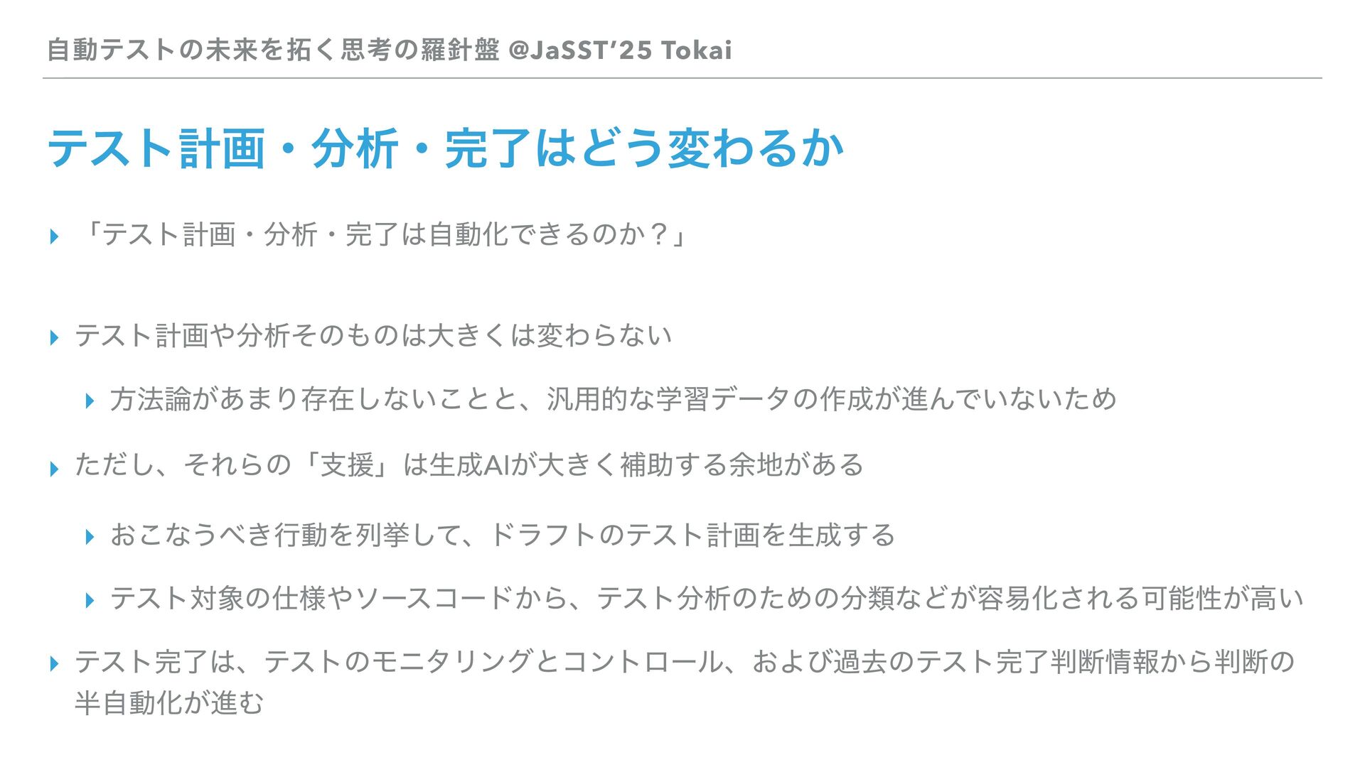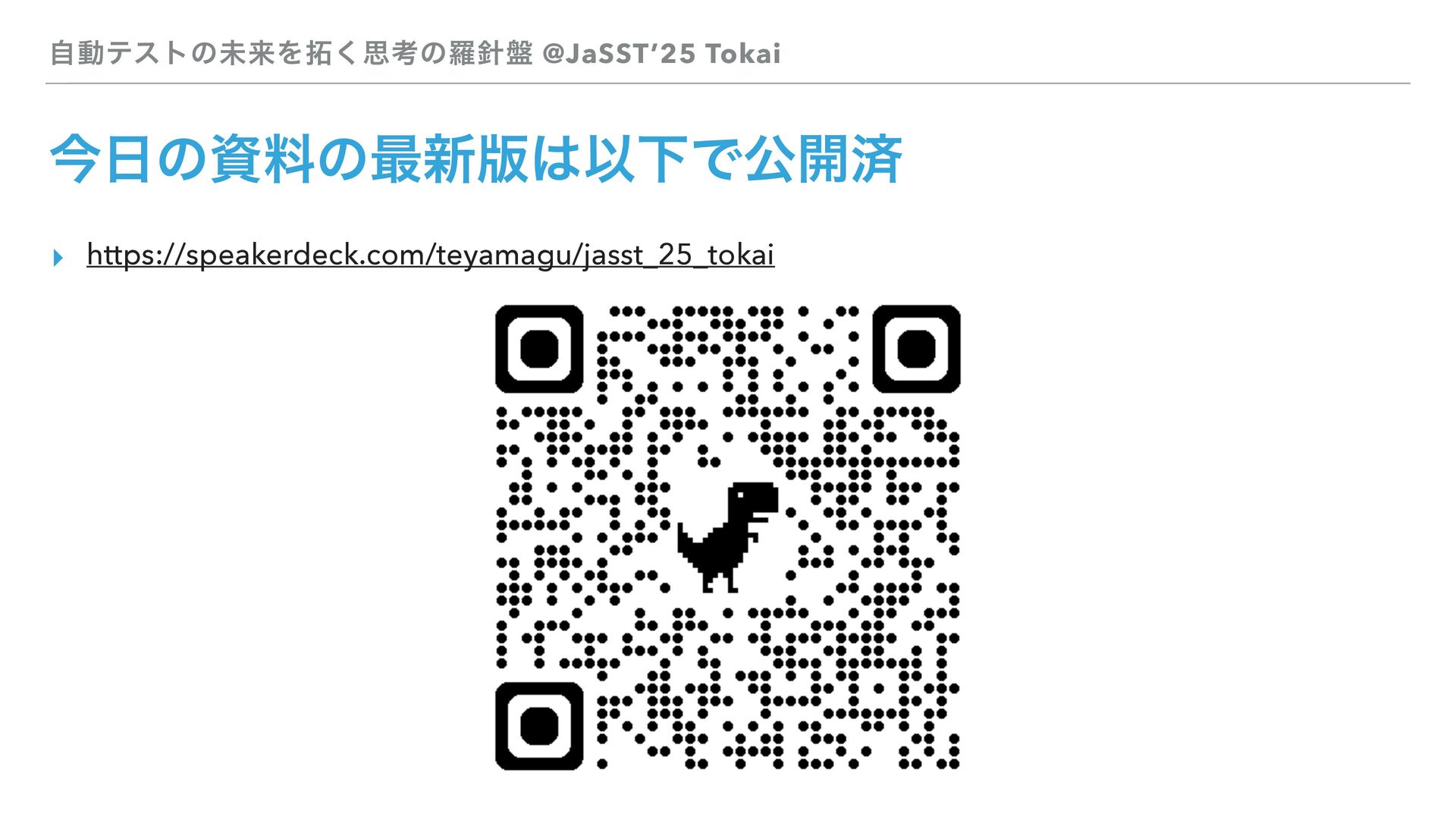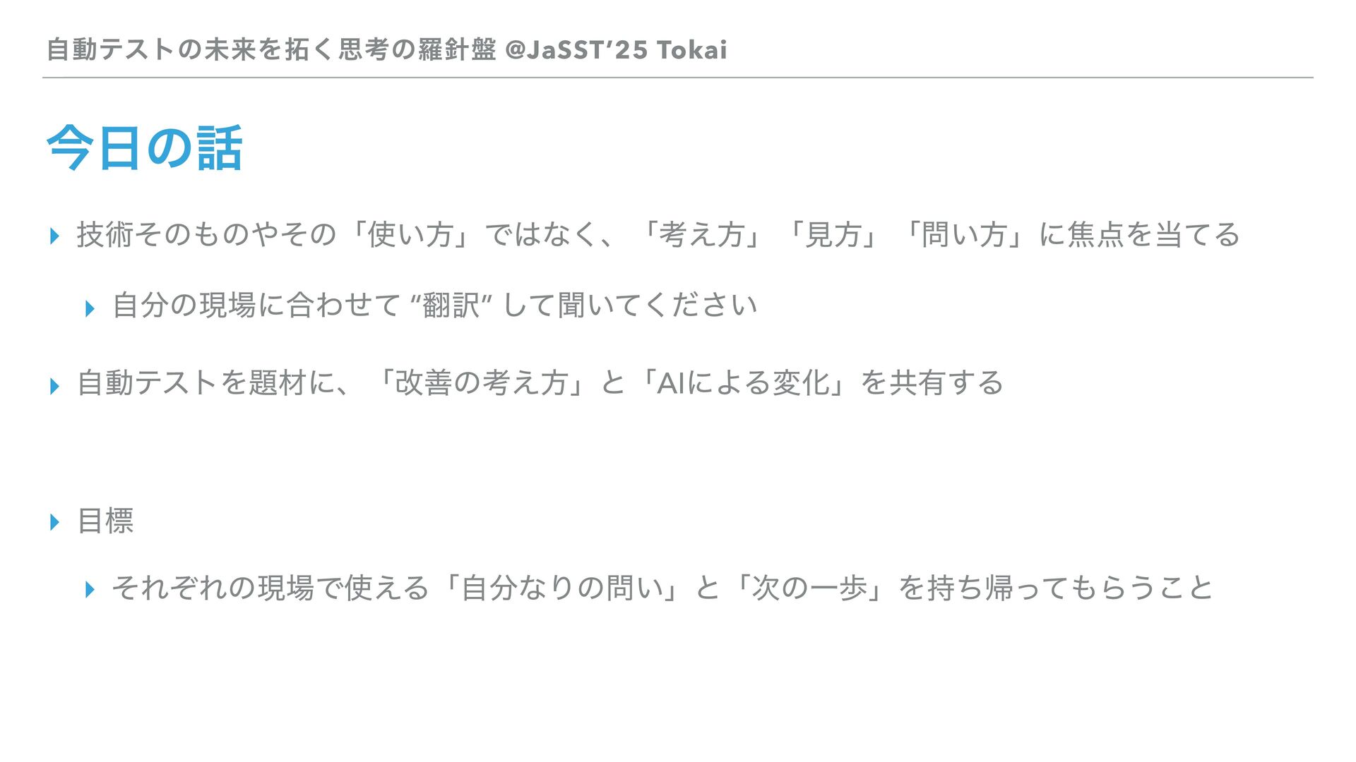 6. ࣗಈςετͷະདྷΛ୓͘ࢥߟͷཏ਑൫ @JaSST’25 Tokai ໰͍ᶅɿʮޮՌతʹ඼࣭޲্ͤ͞ΔͨΊʹɺԿΛ૊৫ʹීٴͤ͞Δ΂͖͔ʁʯ ɹɹɹɹɹɹɹɹɹɹɹɹɹɹɹɹɹɹɹɹɹ → ීٴͤ͞Δ΂͖͸ࣗಈςετ ▸ ໰͍ᶅ ▸