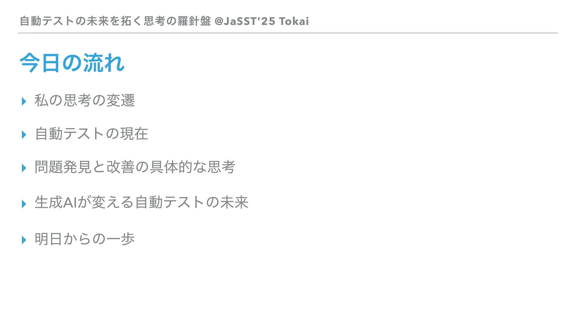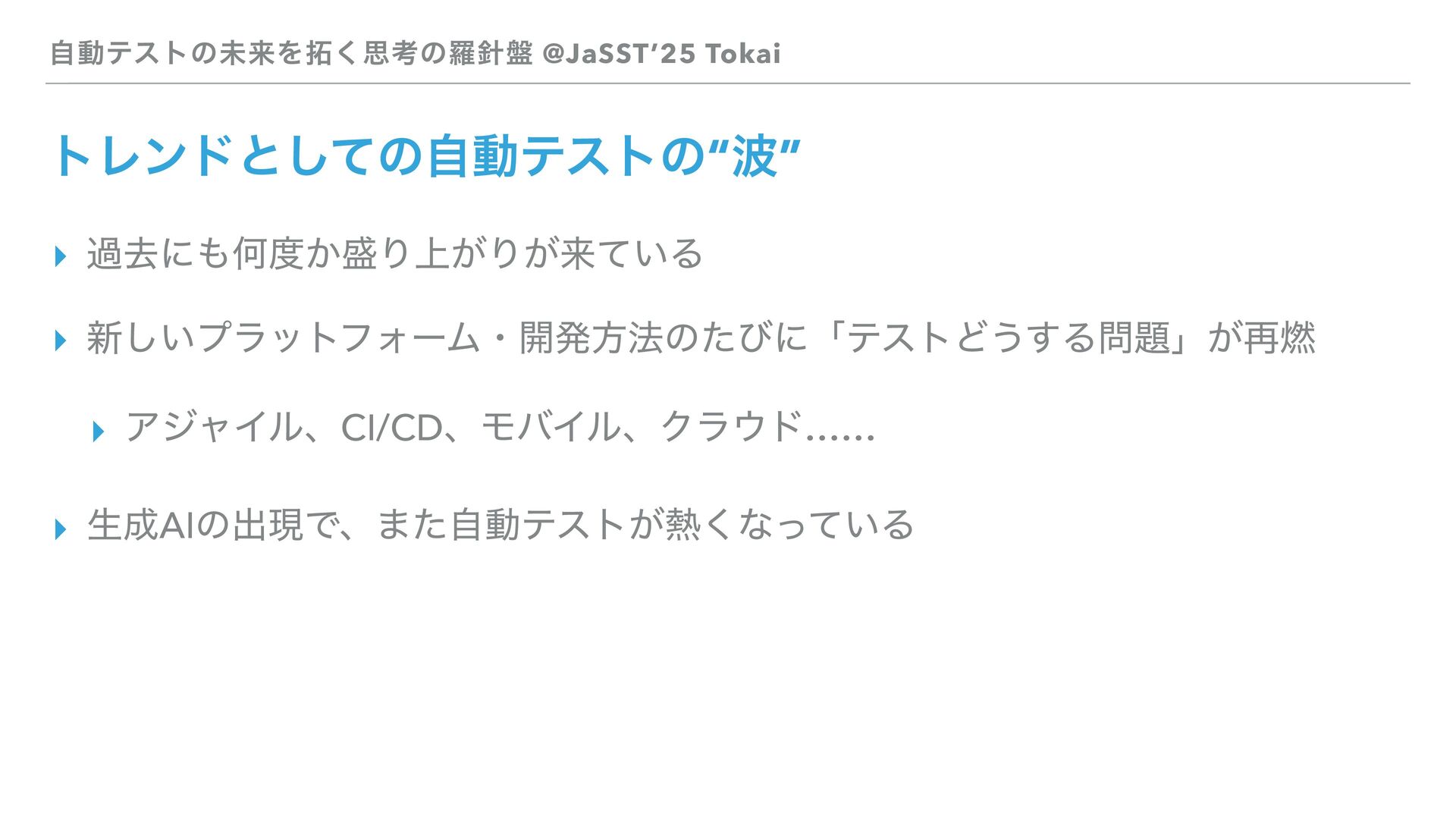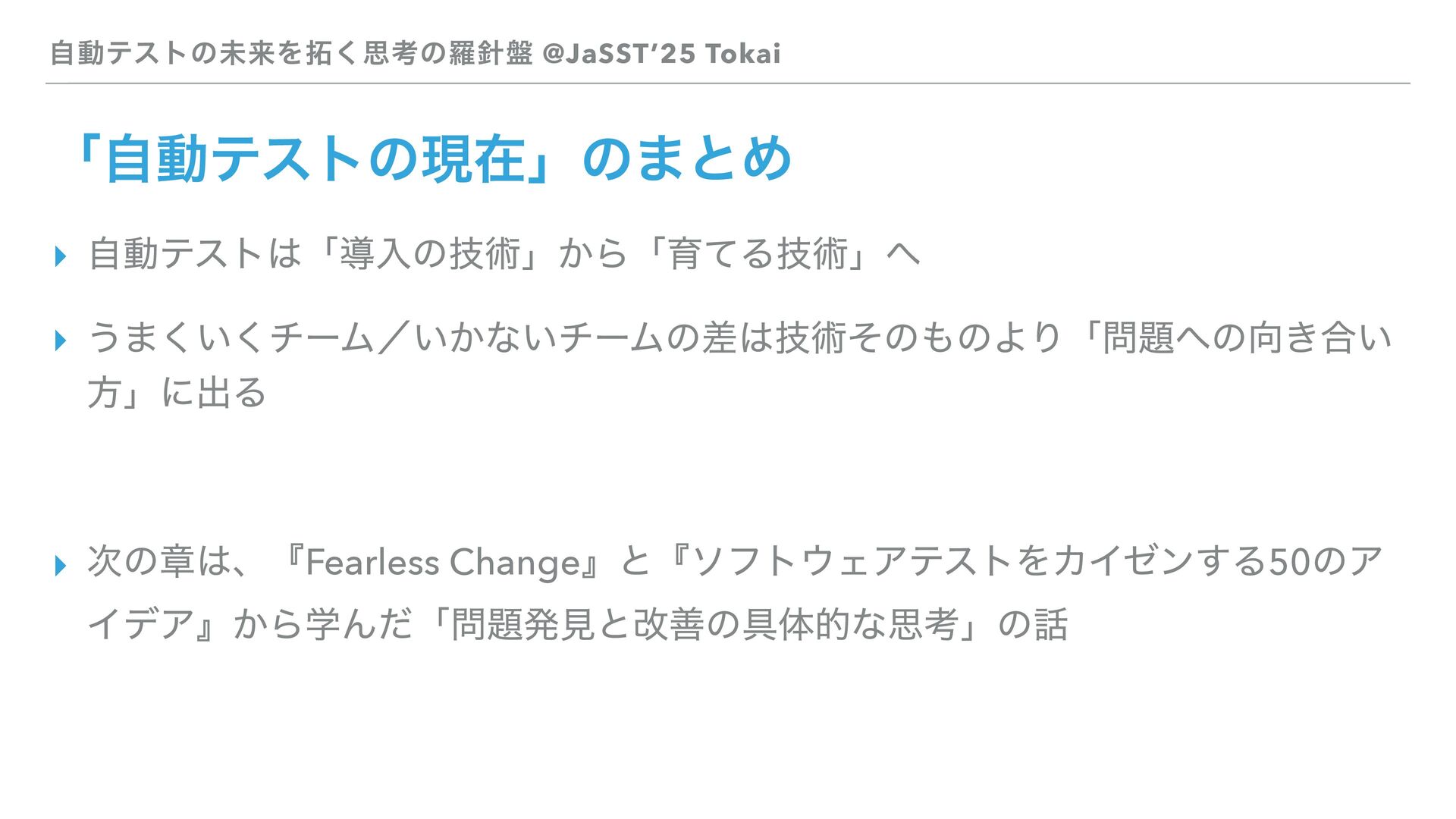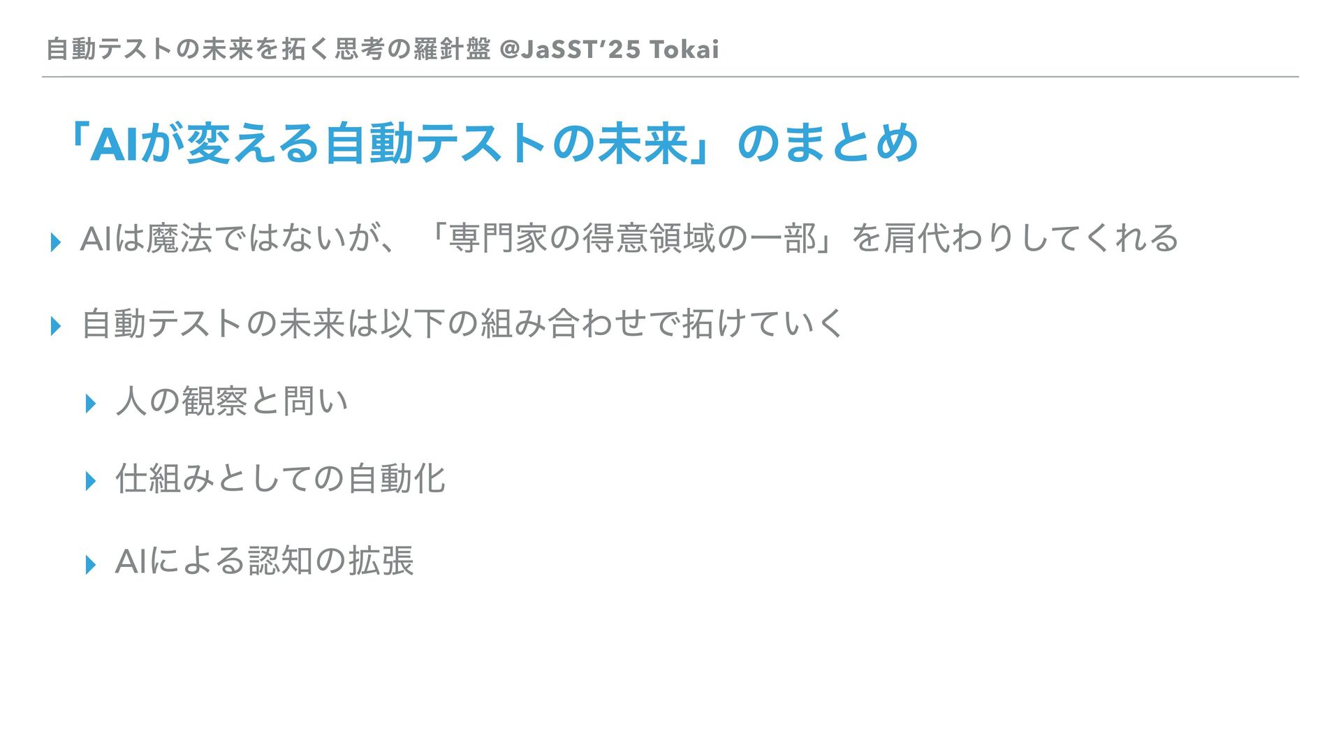6. ࣗಈςετͷະདྷΛ୓͘ࢥߟͷཏ਑൫ @JaSST’25 Tokai ໰͍ᶅɿʮޮՌతʹ඼࣭޲্ͤ͞ΔͨΊʹɺԿΛ૊৫ʹීٴͤ͞Δ΂͖͔ʁʯ ɹɹɹɹɹɹɹɹɹɹɹɹɹɹɹɹɹɹɹɹɹ → ීٴͤ͞Δ΂͖͸ࣗಈςετ ▸ ໰͍ᶅ ▸
