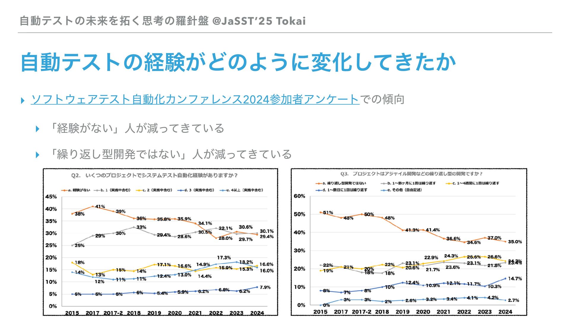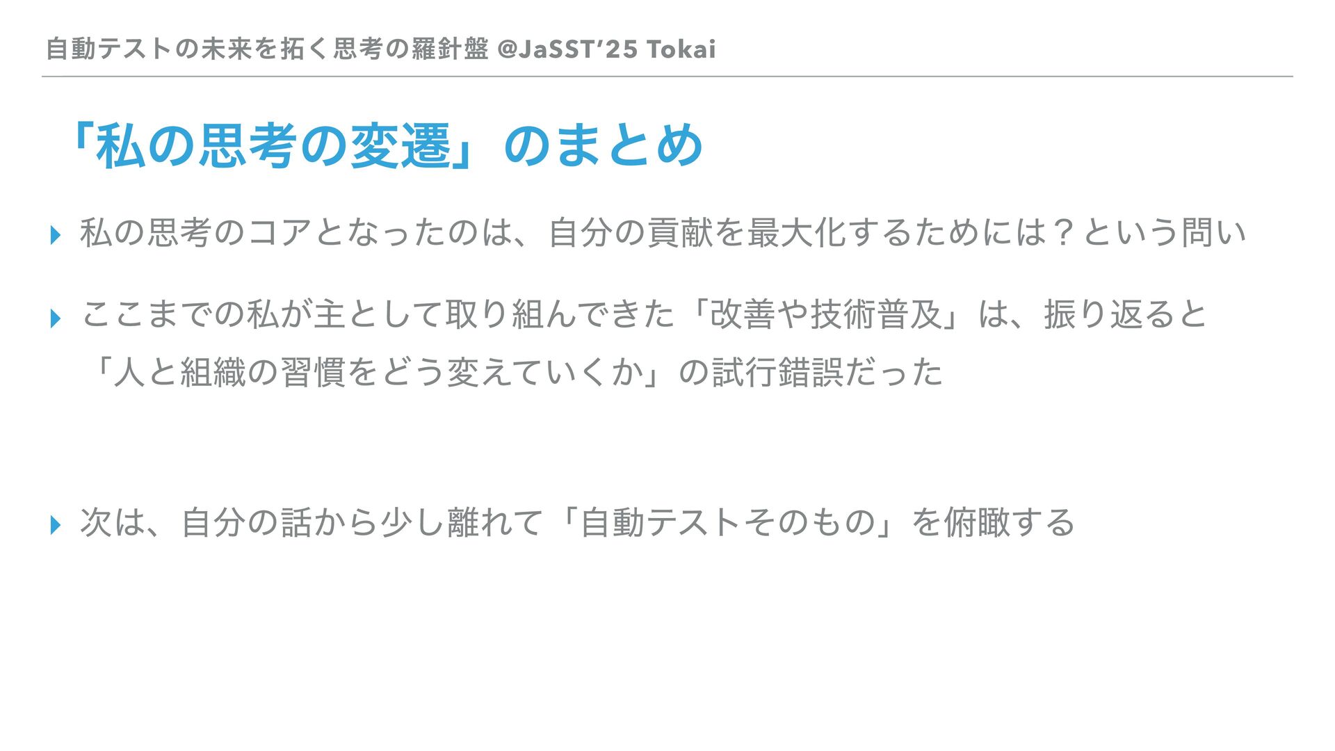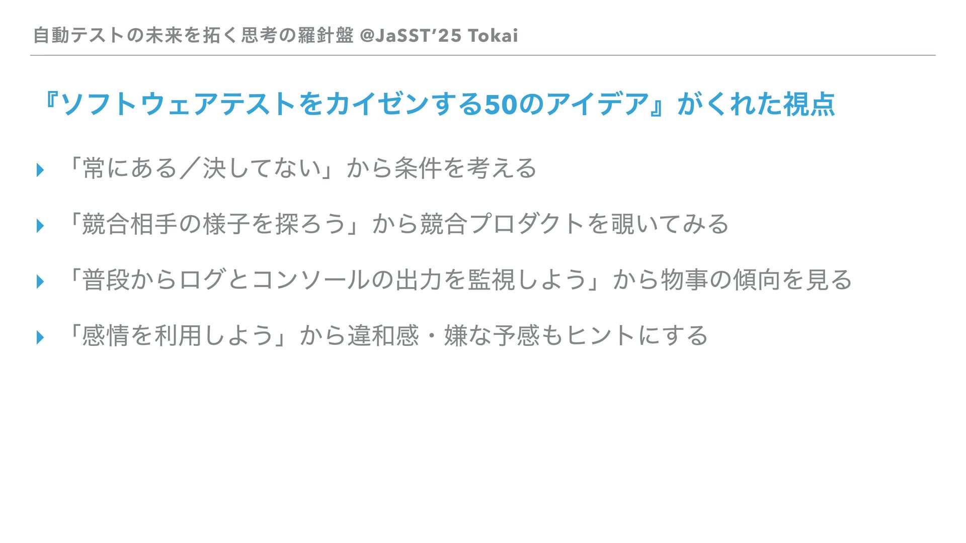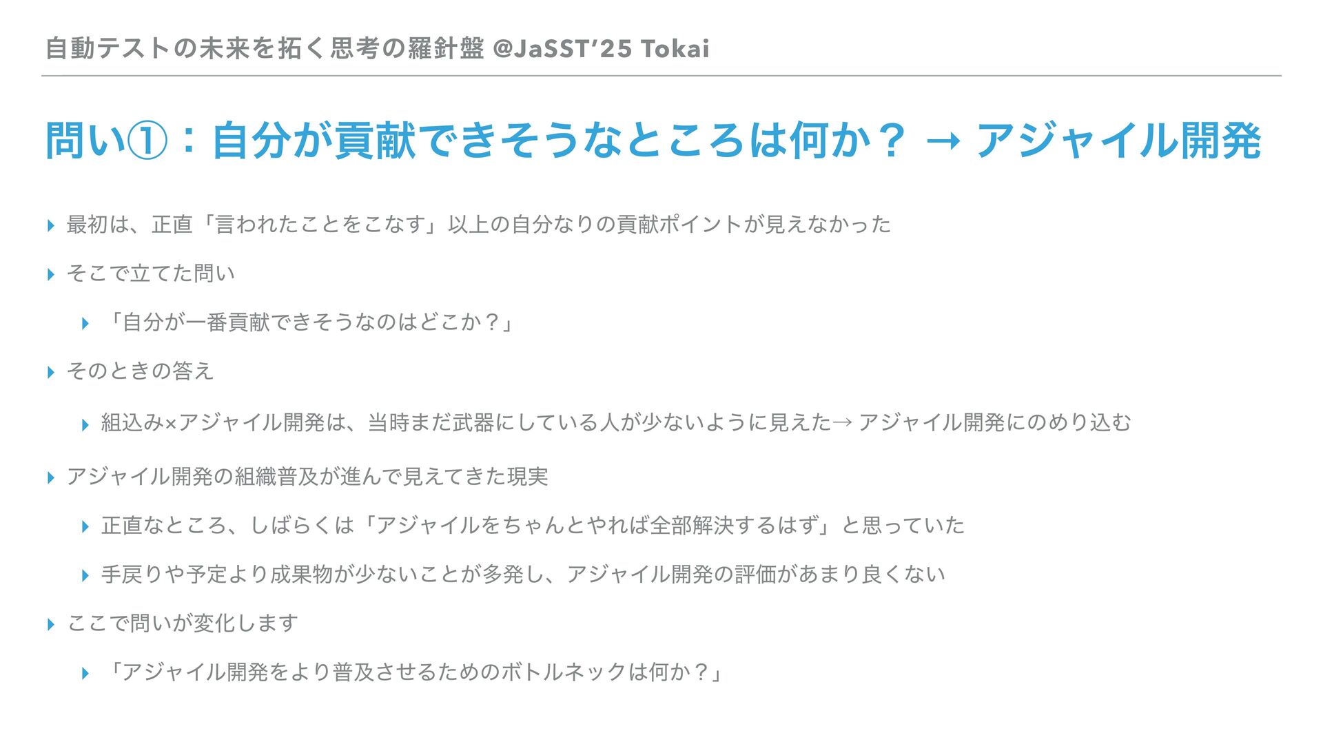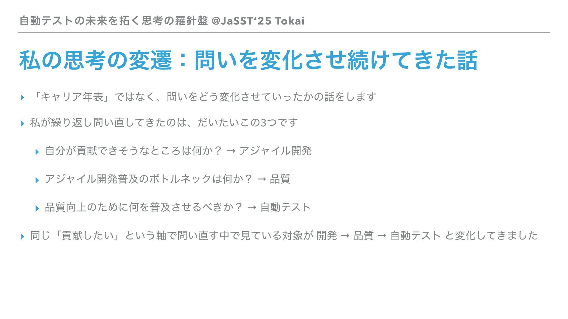 3. ࣗಈςετͷະདྷΛ୓͘ࢥߟͷཏ਑൫ @JaSST’25 Tokai ࢲͷࢥߟͷมભɿ໰͍ΛมԽͤ͞ଓ͚͖ͯͨ࿩ ▸ ʮΩϟϦΞ೥දʯͰ͸ͳ͘ɺ໰͍ΛͲ͏มԽ͍͔ͤͯͬͨ͞ͷ࿩Λ͠·͢ ▸ ࢲ͕܁Γฦ͠໰͍௚͖ͯͨ͠ͷ͸ɺ͍͍ͩͨ͜ͷ3ͭͰ͢ ▸ ࣗ෼͕ߩݙͰ͖ͦ͏ͳͱ͜Ζ͸Կ͔ʁ