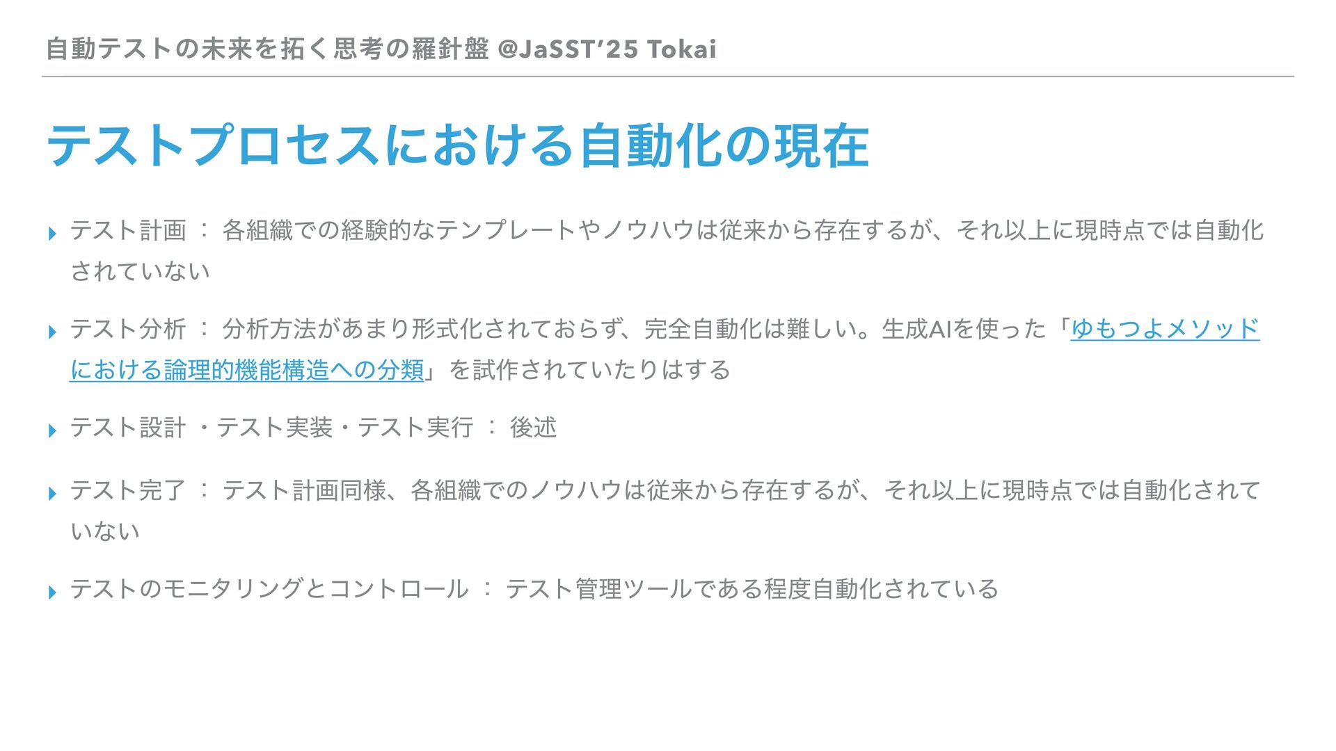 8. ࣗಈςετͷະདྷΛ୓͘ࢥߟͷཏ਑൫ @JaSST’25 Tokai ςετϓϩηεʹ͓͚ΔࣗಈԽͷݱࡏ ▸ ςετܭը ɿ ֤૊৫ͰͷܦݧతͳςϯϓϨʔτ΍ϊ΢ϋ΢͸ैདྷ͔Βଘࡏ͢Δ͕ɺͦΕҎ্ʹݱ࣌఺Ͱ͸ࣗಈԽ ͞Ε͍ͯͳ͍ ▸