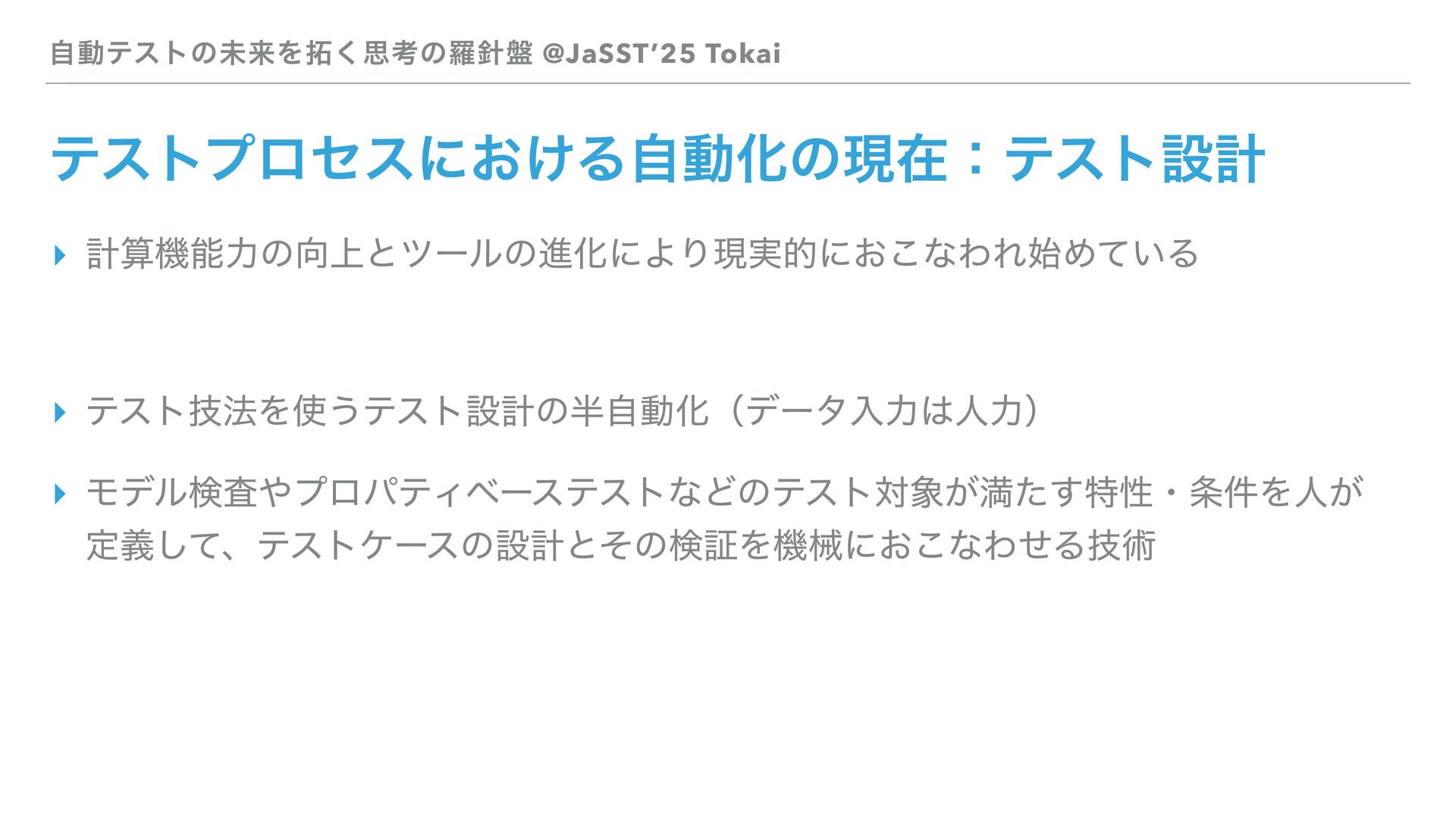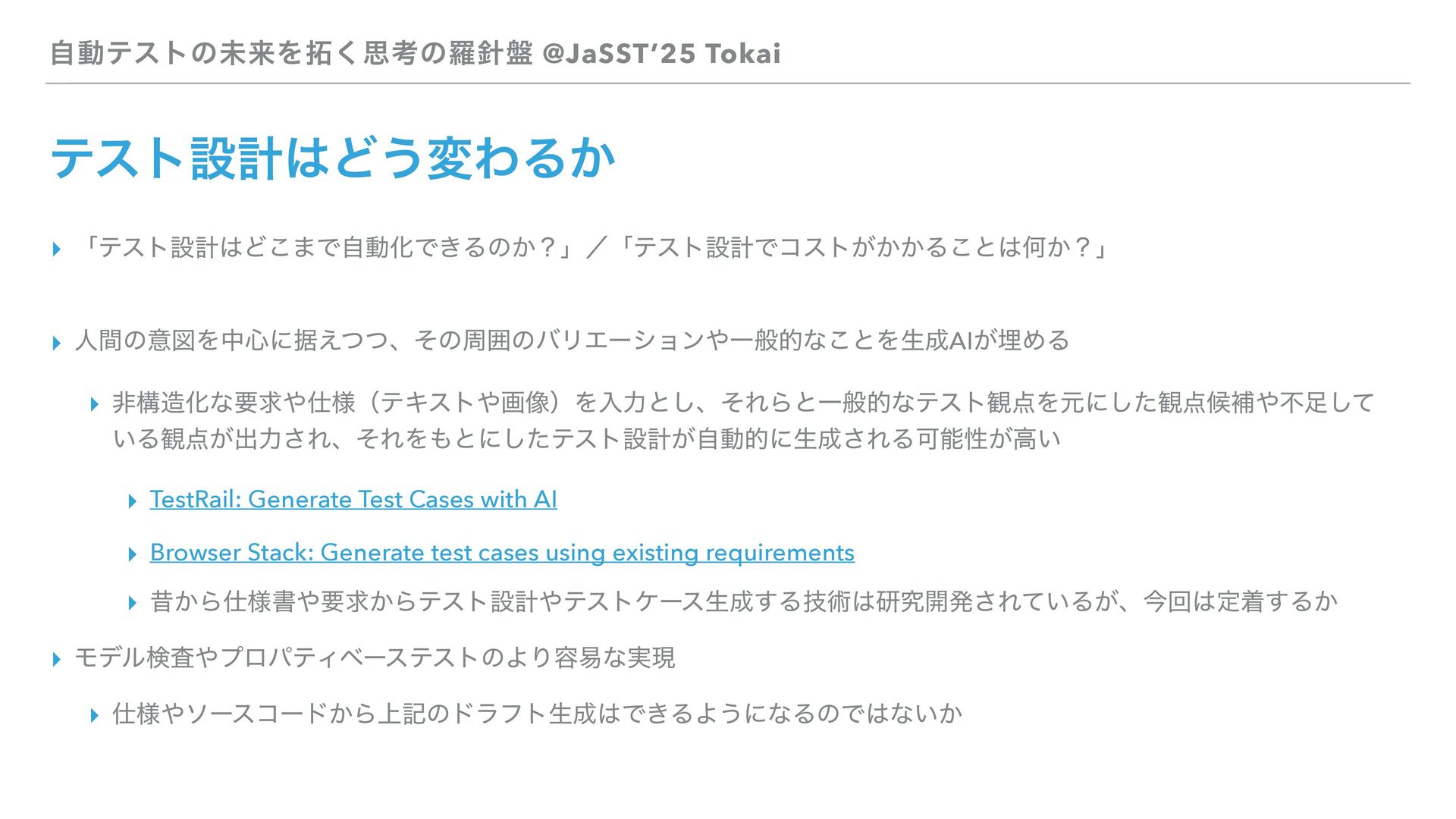 18. ࣗಈςετͷະདྷΛ୓͘ࢥߟͷཏ਑൫ @JaSST’25 Tokai ςετઃܭ͸Ͳ͏มΘΔ͔ ▸ ʮςετઃܭ͸Ͳ͜·ͰࣗಈԽͰ͖Δͷ͔ʁʯʗʮςετઃܭͰίετ͕͔͔Δ͜ͱ͸Կ͔ʁʯ ▸ ਓؒͷҙਤΛத৺ʹਾ͑ͭͭɺͦͷपғͷόϦΤʔγϣϯ΍Ұൠతͳ͜ͱΛੜ੒AI͕ຒΊΔ ▸ ඇߏ଄Խͳཁٻ΍࢓༷ʢςΩετ΍ը૾ʣΛೖྗͱ͠ɺͦΕΒͱҰൠతͳςετ؍఺Λݩʹͨ͠؍఺ީิ΍ෆ଍ͯ͠