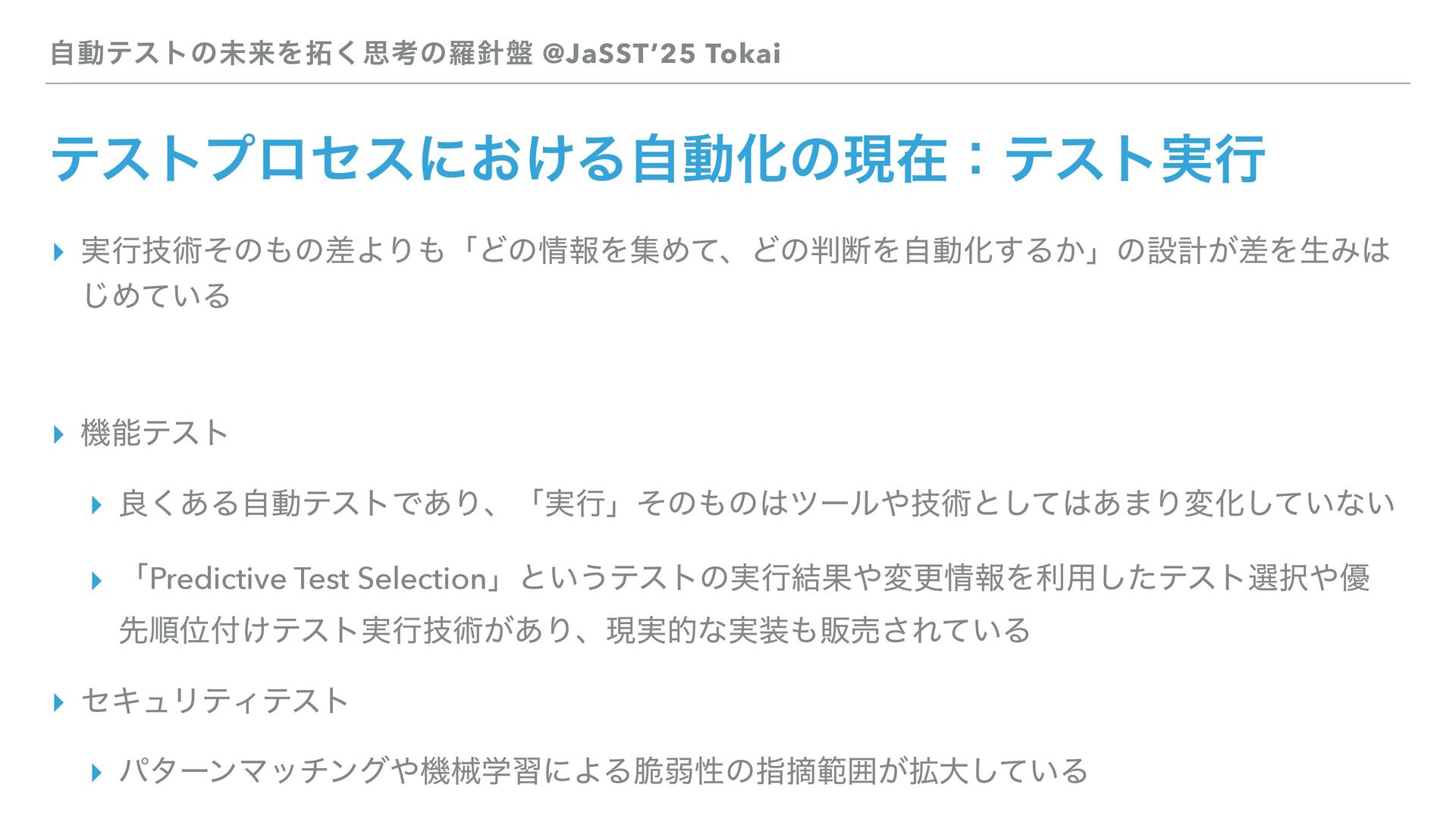 ྑ͋͘ΔࣗಈςετͰ͋Γɺʮ࣮ߦʯͦͷ΋ͷ͸πʔϧ΍ٕज़ͱͯ͠͸͋·ΓมԽ͍ͯ͠ͳ͍ ▸ ʮPredictive Test Selectionʯͱ͍͏ςετͷ࣮ߦ݁Ռ΍มߋ৘ใΛར༻ͨ͠ςετબ୒΍༏ ઌॱҐ෇͚ςετ࣮ߦٕज़͕͋Γɺݱ࣮తͳ࣮૷΋ൢച͞Ε͍ͯΔ ▸ ηΩϡϦςΟςετ ▸ ύλʔϯϚονϯά΍ػցֶशʹΑΔ੬ऑੑͷࢦఠൣғ͕֦େ͍ͯ͠Δ